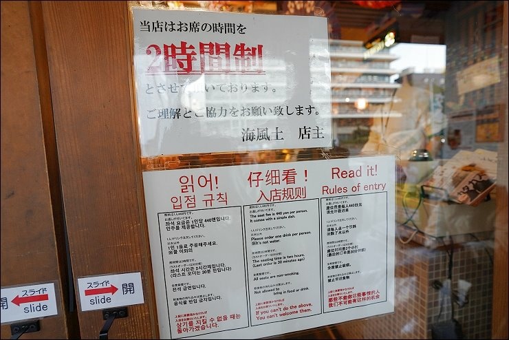 排隊時看一下店門口貼給外國人看的入店規則,用餐時間限2小時,入座後每人收お通し440円,附一盤小菜,每人要點一杯飲料(水除外)、全面禁煙、禁止攜帶外食,這些都很基本!