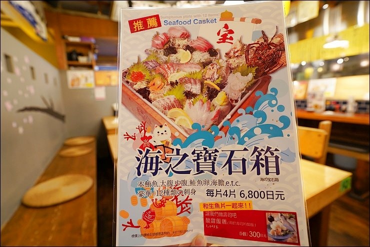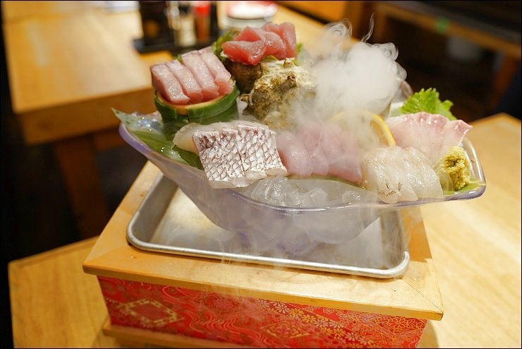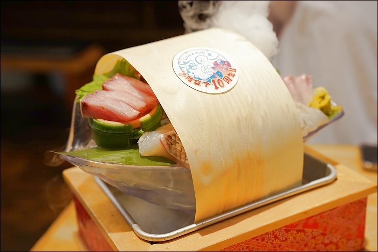 海之玉手箱是海風土居酒屋的招牌,桌桌必點!送上桌時先用一層紙板包著,等我們都準備好服務生才把它打開!冒著乾冰好像海裡剛出來的魚片!有六種魚肉,每種四片,總共24片,魚肉厚實,這一大盤只要550円含稅,難怪每桌都點!