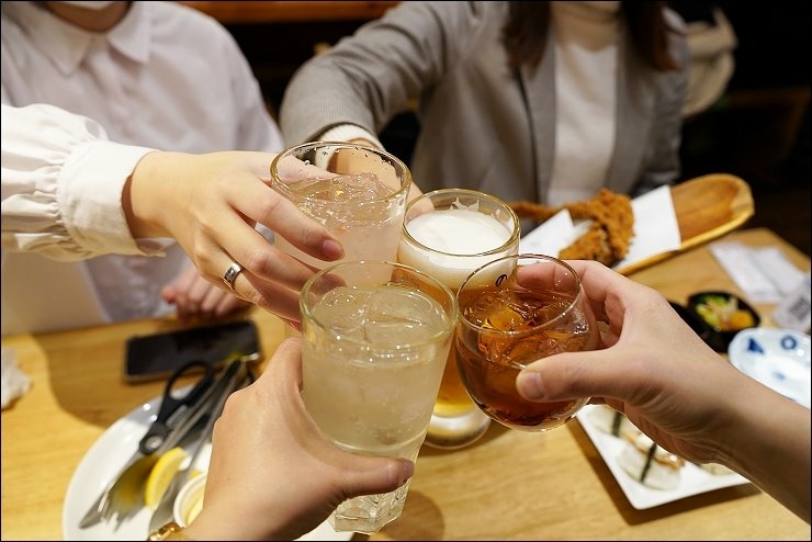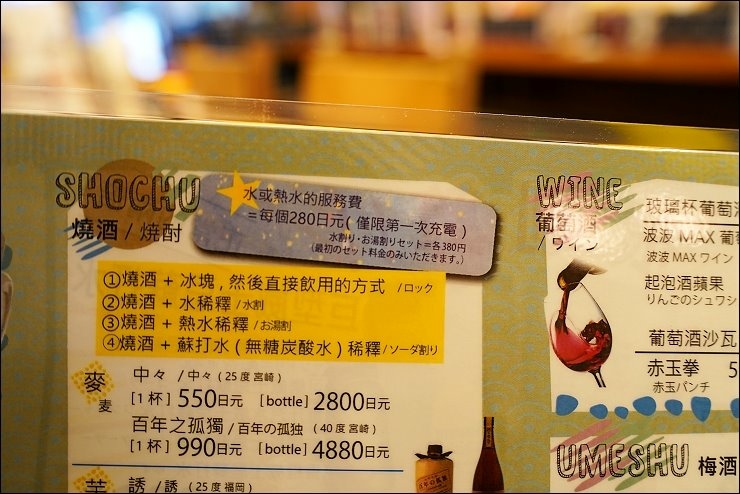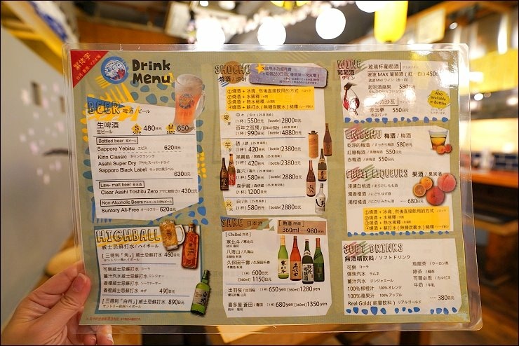 入座後看菜單,有中文菜單不怕看不懂!日本習慣都先點杯飲料,很多日本人都是直接先點一杯生啤酒,菜單上一大顆新鮮鳳梨沙瓦看起來很猛,也是人氣王,不過今天鳳梨缺貨,點個葡萄柚沙瓦來喝喝補充一下維他命C。