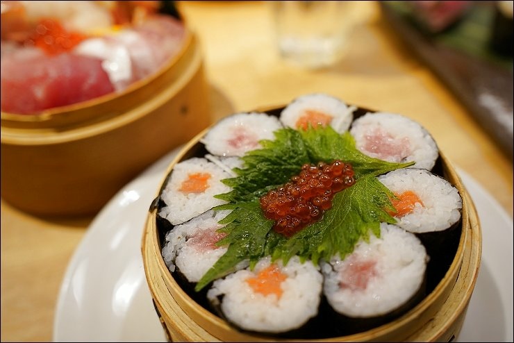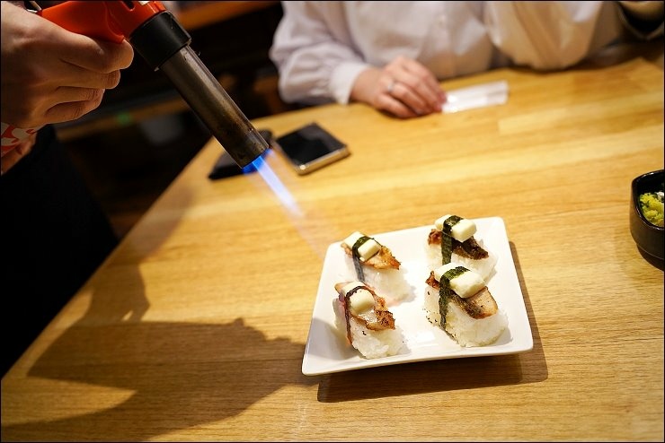 鰻魚奶油壽司,店員會在上桌時用噴槍現場炙燒,鰻魚跟奶油的香氣在大火炙燒過,香氣逼人,立刻每人夾一顆清盤!
