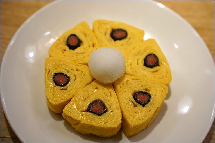 明太子玉子燒,擺盤像朵花,中間包著博多特產明太子,玉子燒多汁又鮮嫩,可惜有點鹹。