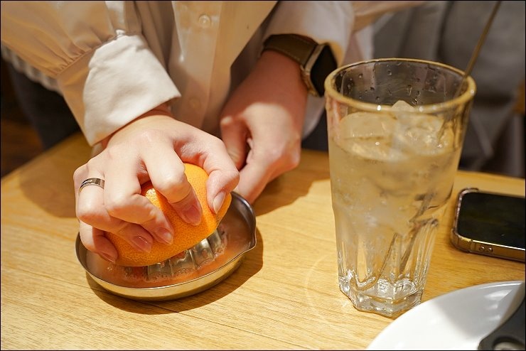 飲料要喝鳳梨沙瓦實在不簡單,要先把鳳梨汁擠出來,放到沙瓦裡,同行的男性友人說,日本的鳳梨味道是偏酸,加在沙瓦裡意外好喝,鳳梨汁味道很重,擠完果汁後的鳳梨果肉也可以挖來吃。