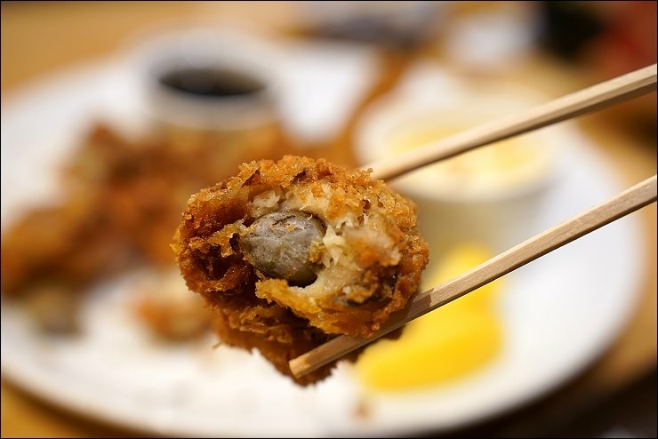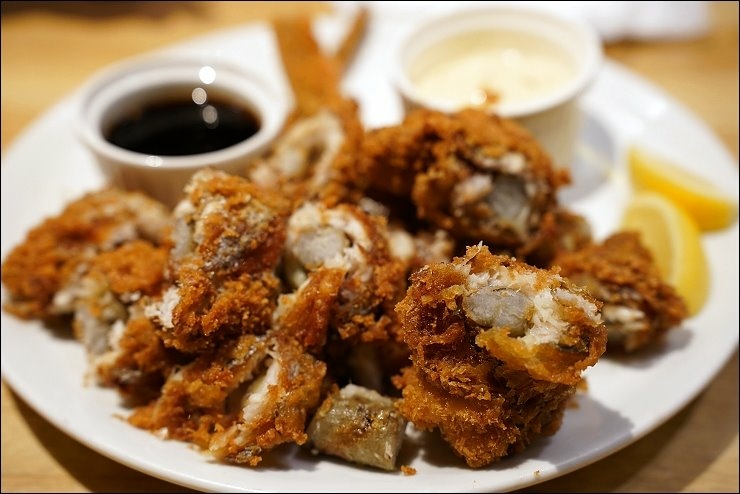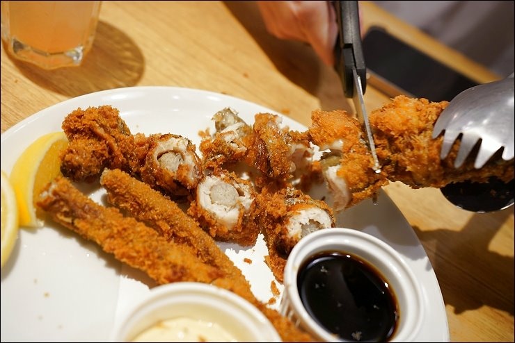 太刀魚就是我們說的白帶魚,白帶魚細細長長的,這道料理是把白帶魚魚肉纏繞捲在牛篣上,再裹粉再去油炸!用剪刀剪成一段一段,切面可以看到白帶肉包著牛蒡,白帶魚肉很細嫩,中間的牛蒡脆口,沾上特製醬油或塔塔醬再吃比較溼潤。對了,這道現炸建議趁熱吃哦!