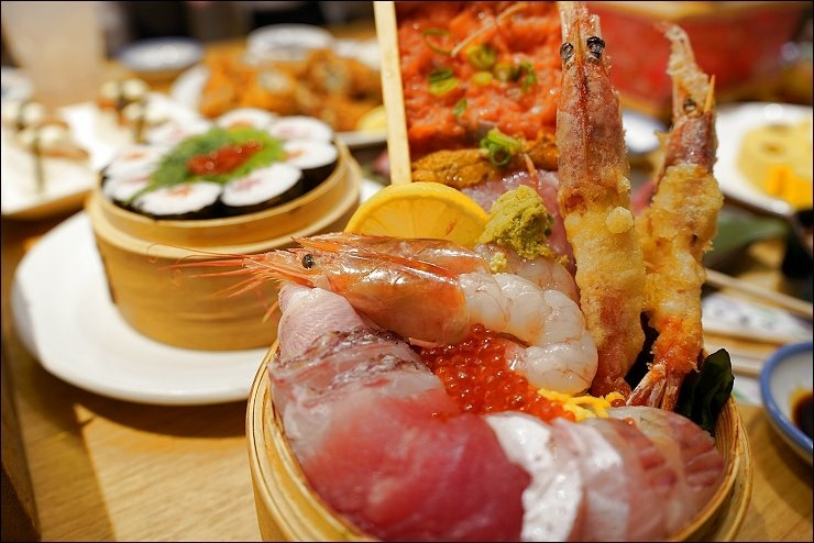 喜歡吃蝦的朋友這道究極海寶蓋飯可以滿足!上層是滿滿的海鮮,下層是鐵火卷,絕對吃的飽飽飽。