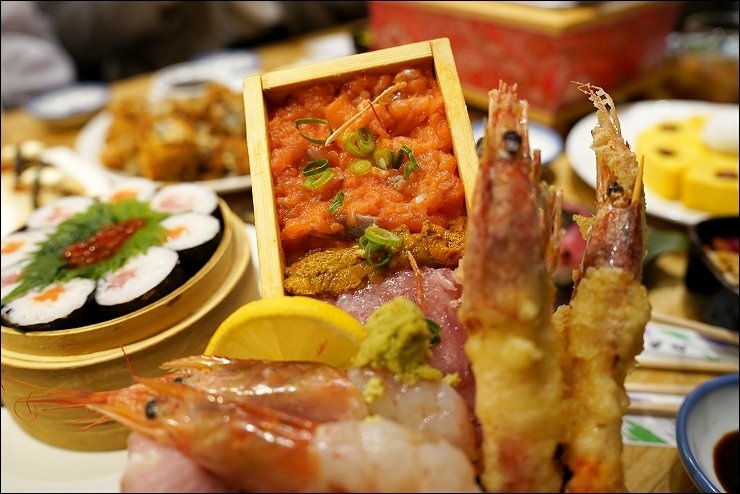 這道海之寶石箱是專為台灣家族旅客特別推出的新菜單,不是家人一起出國,跟朋友相約出國自助,也可以直接點這道啦!!伊勢龍蝦、海膽、本鮪魚、大腹、中腹、鮭魚卵等12種類皫魚刺身,每種四片,滿滿超大一盤6800円,豪華指數破表!也可以加點醋飯糰自己動手加工成握壽司哦!