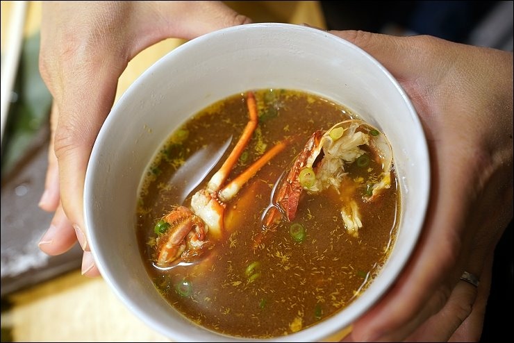 龍蝦刺身完食,店家會把龍蝦頭拿去煮龍蝦味噌湯,我們一桌四個人,店家上來四碗龍蝦味噌湯,還有不少蝦黃在湯裡,這碗份量不小,大滿足!