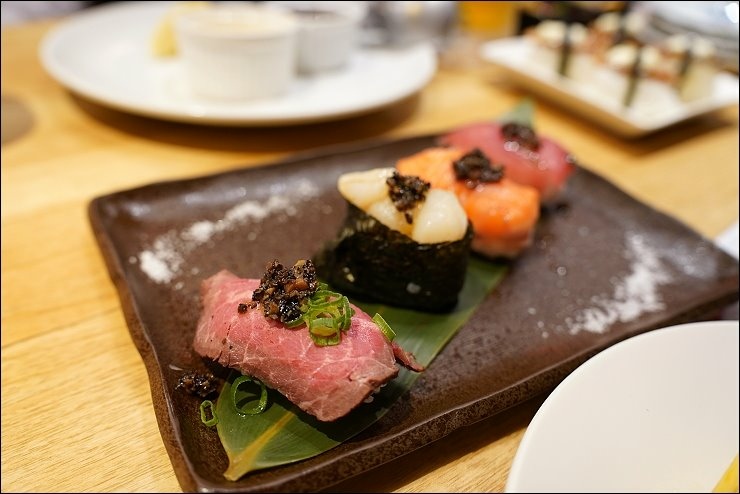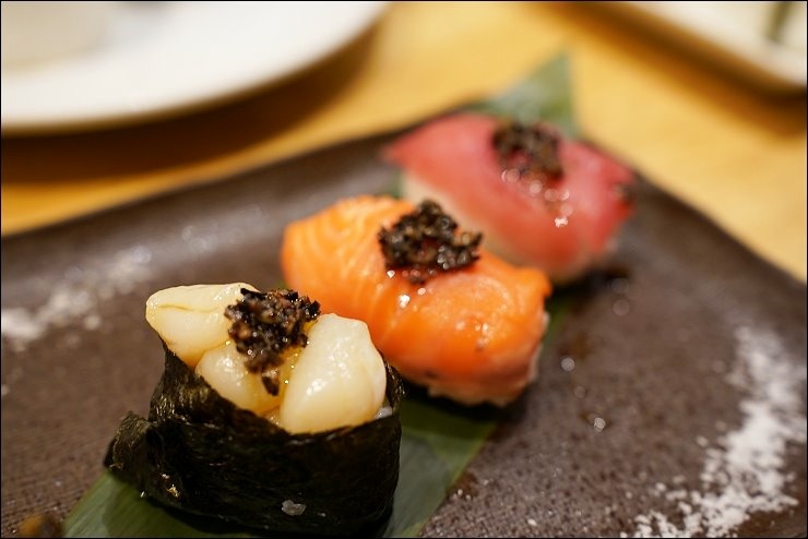松露壽司,有干貝、鮭魚、日本牛肉、鮪魚共四貫,上頭有不少松露,松露香氣滿口。