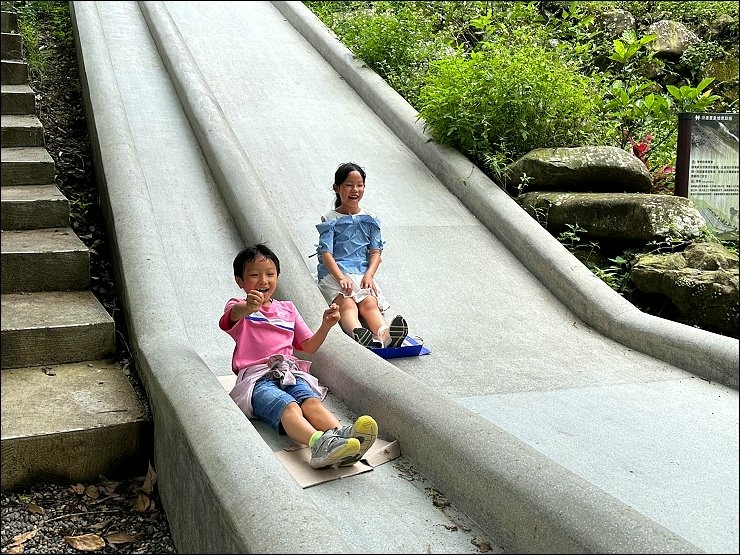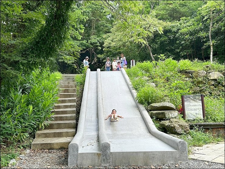 經過拱橋後是一個廣場,廣場有個小朋友超喜歡的磨石子溜滑梯,旁邊有木頭躺椅,走累了可以在這邊休息一下!這次有特別準備紙板,小朋友溜滑梯如有神助,愈溜愈順,速度也愈快,刺激哦!小朋友很容易玩開了就不想離開啦!