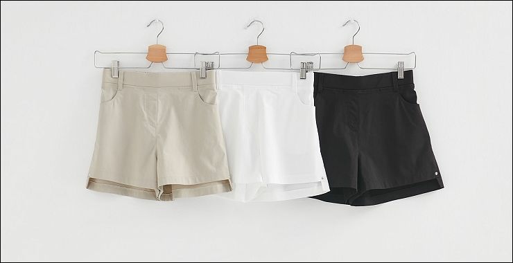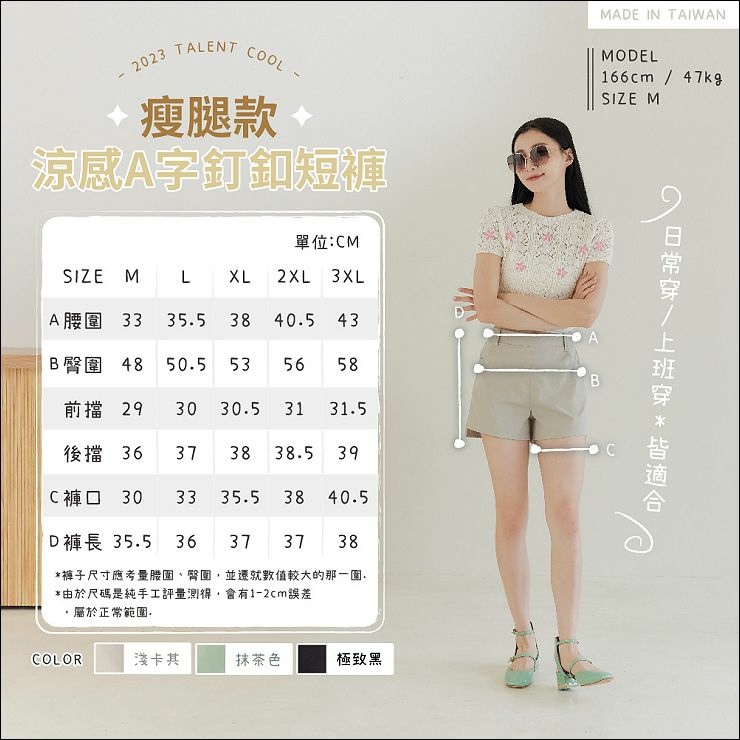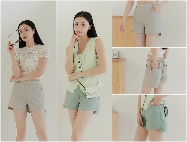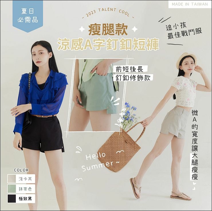 涼感短褲:前短後長釘釦修飾款,微A的寬度讓大腿瘦瘦,更是追小孩最佳戰鬥服。