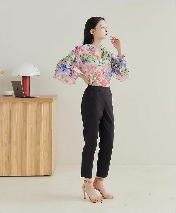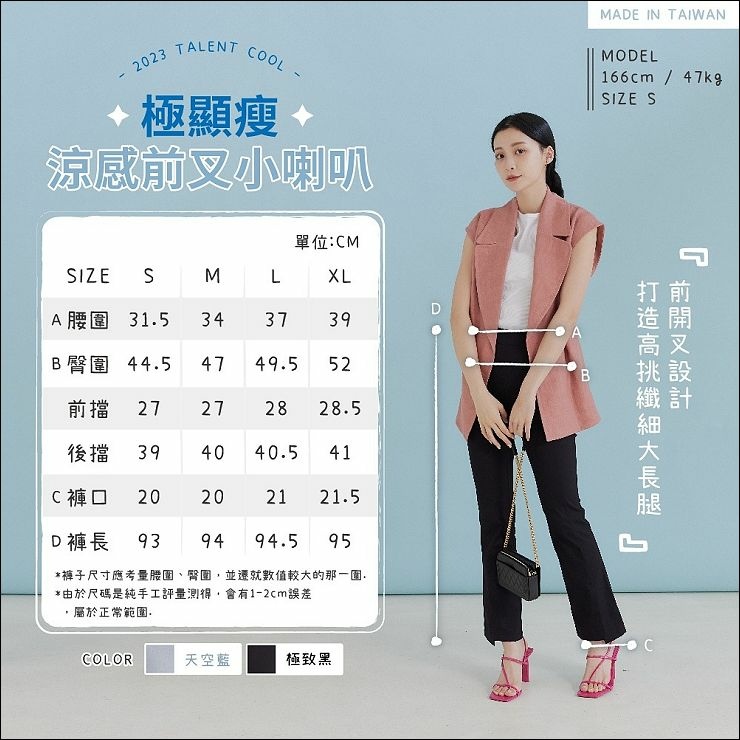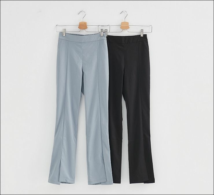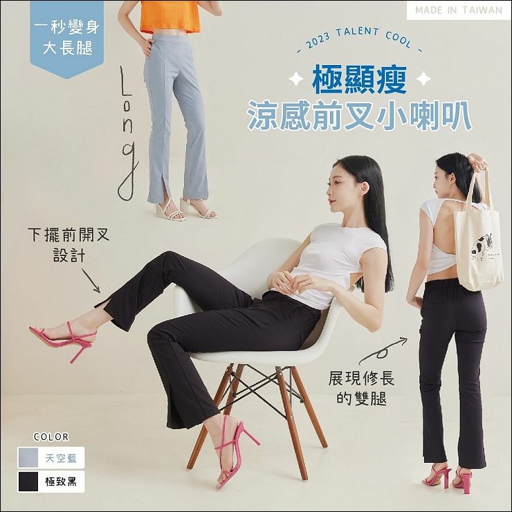 涼感小喇叭:超顯瘦拉大長腿褲款,下擺前開叉的設計,展現修長的雙腿。