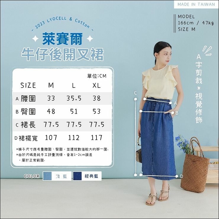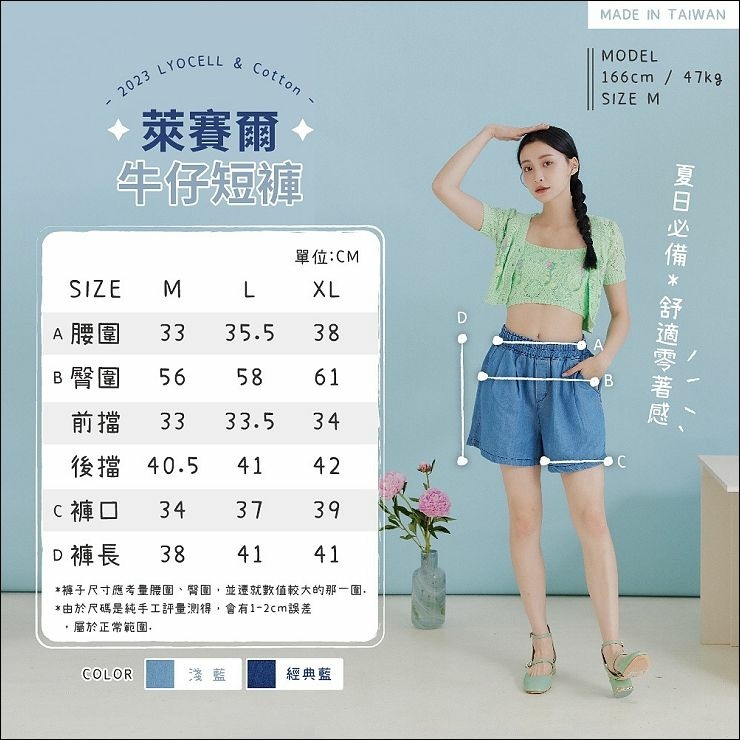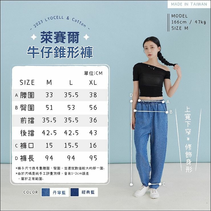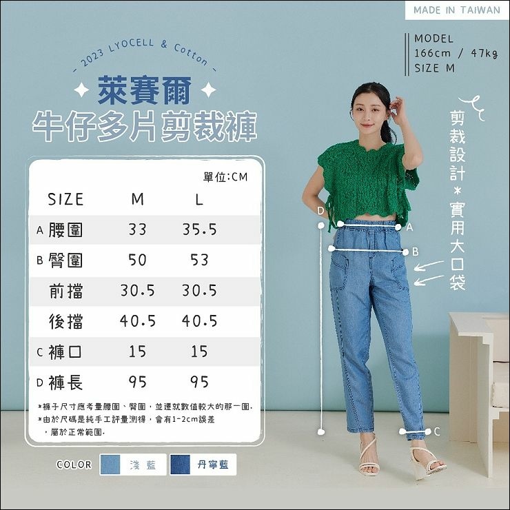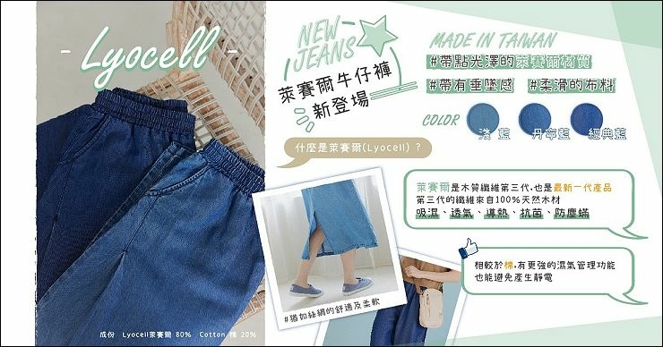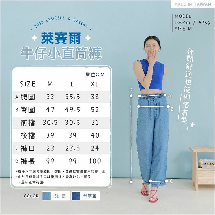 差點忘了提醒大家,萊賽爾牛仔褲的布料沒彈性,要請大家仔細參考尺寸表,斟酌考慮尺寸,下單前也可以私訊客服給予建議喔。