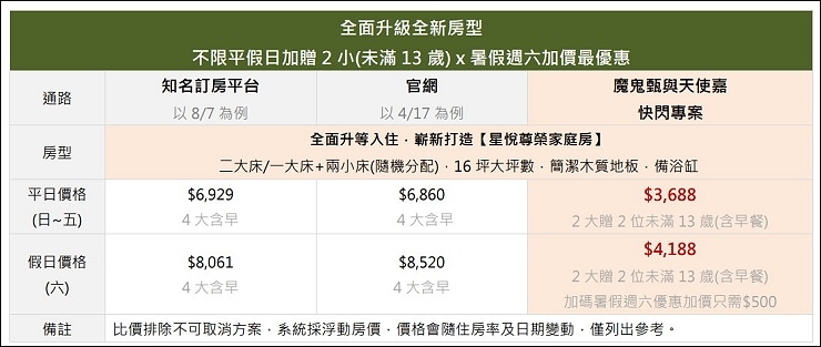 >>2大贈2小含早餐x全面升級全新房型x暑假週六加價最優惠