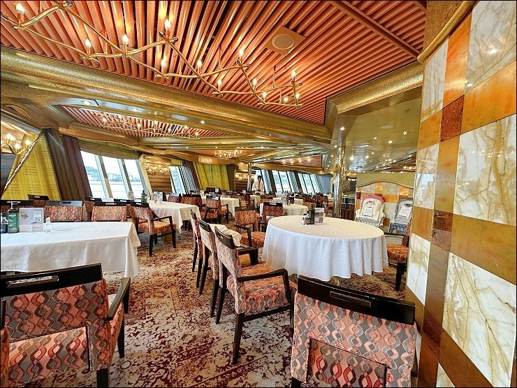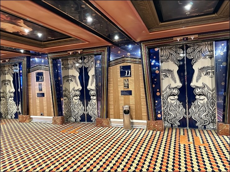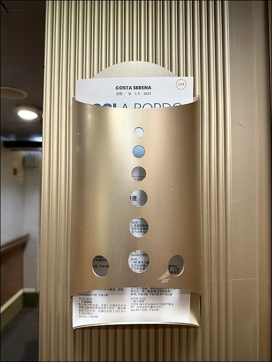 郵輪很大,總共有11樓,每樓從船頭走到船尾也很大!一開始我覺得很容易迷路,後來愈來愈熟,像在逛家裡附近的菜市場!我的訣竅就是認這個透明電梯,這裡靠船頭,然後免費晚餐有二間都是在三樓,一間VESTA,靠船尾的是Ceres,二間的菜色一樣。