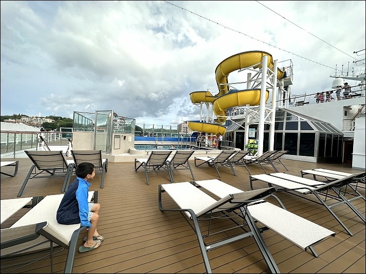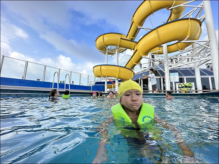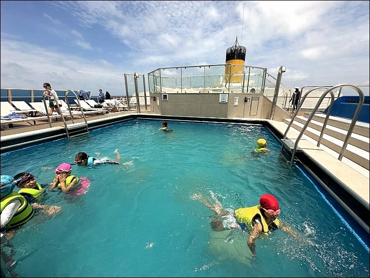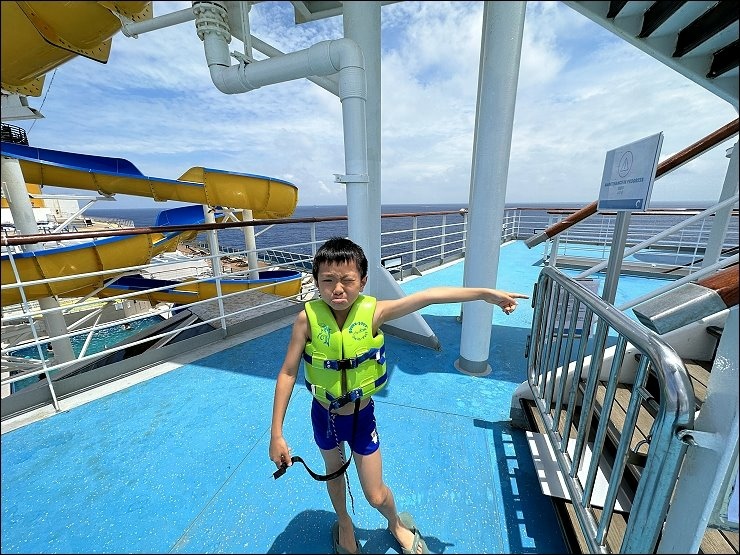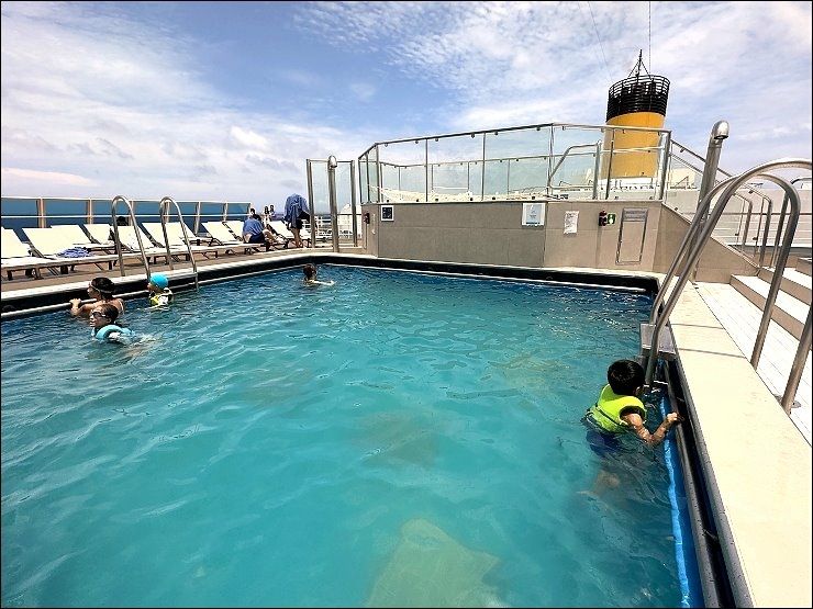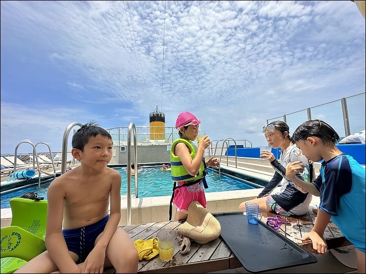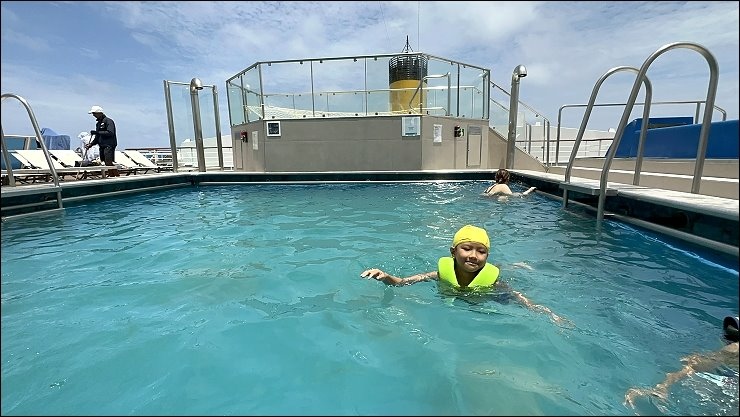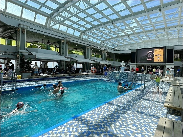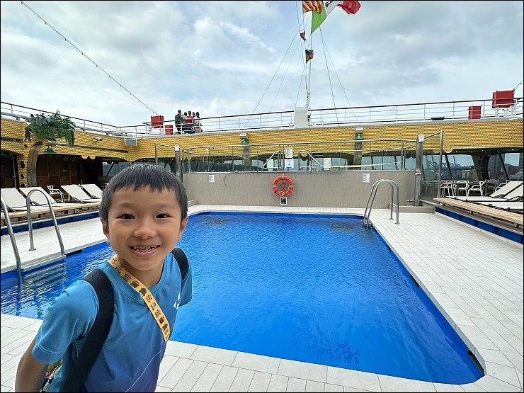 穿過餐廳,靠船尾的地方也有個泳池,所以說,九樓有二個泳池,這邊是做露天的,大太陽白天還滿晒的!莎倫娜號雖然九樓有二個泳池,11樓也有泳池跟水療池,不過說真的,泳池都不大,讓孩子們玩水還行,真要認真游要小心不要踢到其他人。