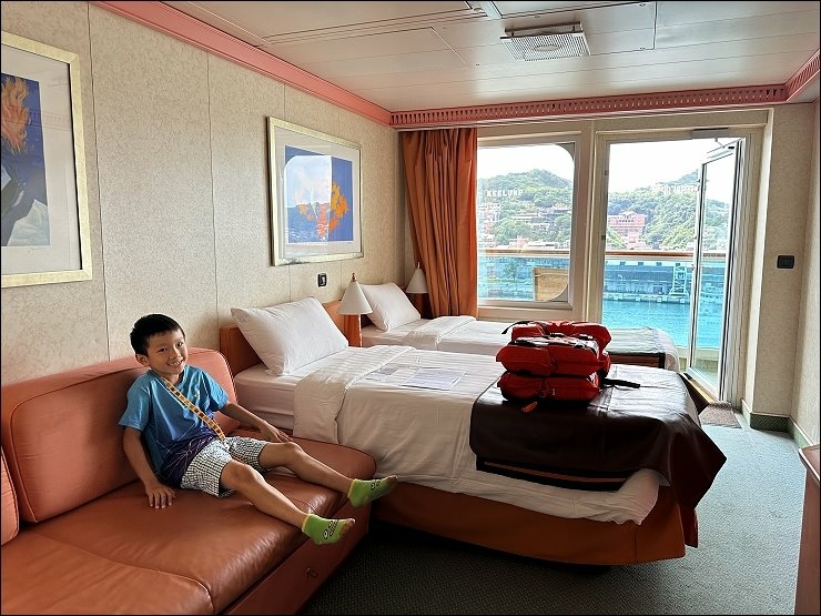我們住的是陽台房,二張單人床跟一張沙發,房間有6坪,空間不小。陽台房很讚,待在這很安靜,不用晒太陽,舒服享受這一大片藍!
