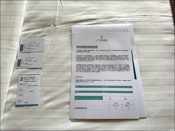 床上放了我們的船卡、晚餐餐廳及時段卡、船上地圖及相關資訊。左上方的船卡很重要,一定要隨身攜帶,它是個人在船上的身份證,也是房卡,還是消費簽帳卡哦!