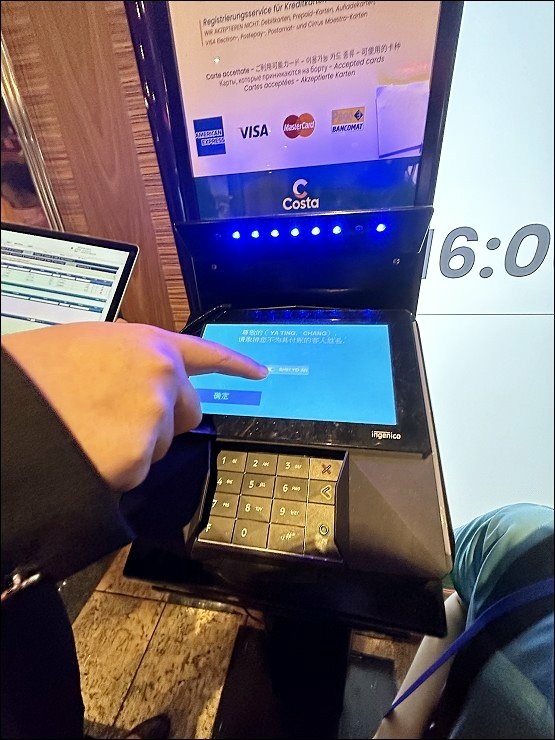 每位乘客都必需將船卡綁定(登船後24小時內綁定),可選擇信用卡或現金結帳,在船上有自費購買商品、喝酒、買包、吃冰、付費餐廳、賭場買個刮刮樂或玩個比大小等等,都是直接刷房卡,比較建議直接綁信用卡,每天結算,半夜手機收到信用卡刷卡通知,最後一天會給明細,若是綁定現金支付的朋友,需要在最後一天一早就去3樓櫃台結帳。