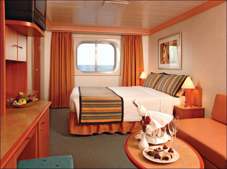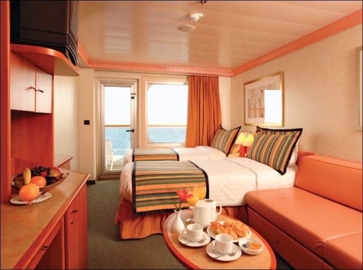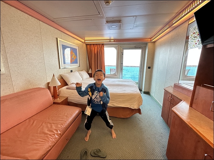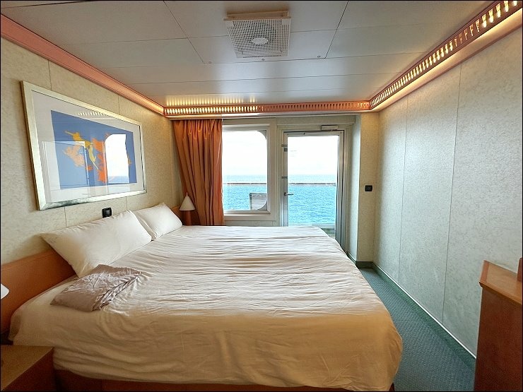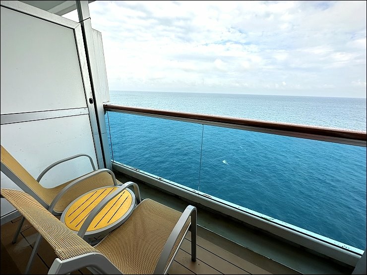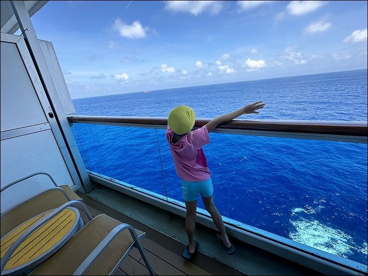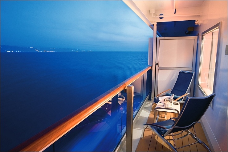 陽台艙:約6坪,擁有私人陽台及躺椅,隨時享受海上陽光,一邊吃著東西一邊看著海景。