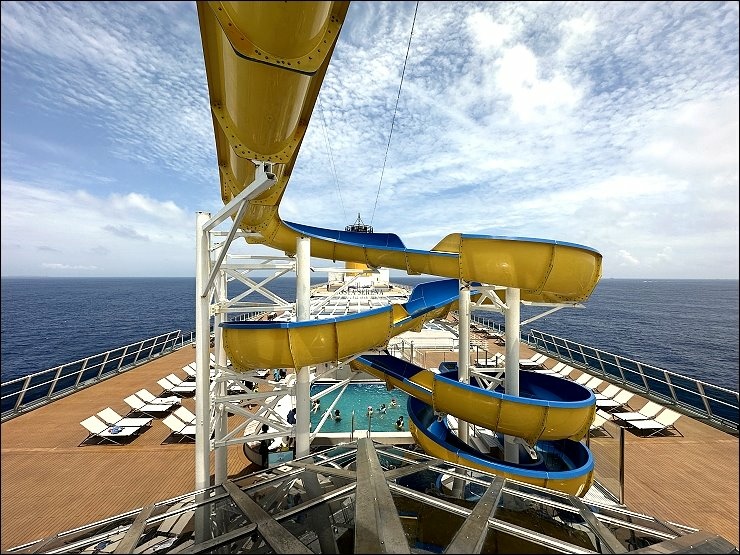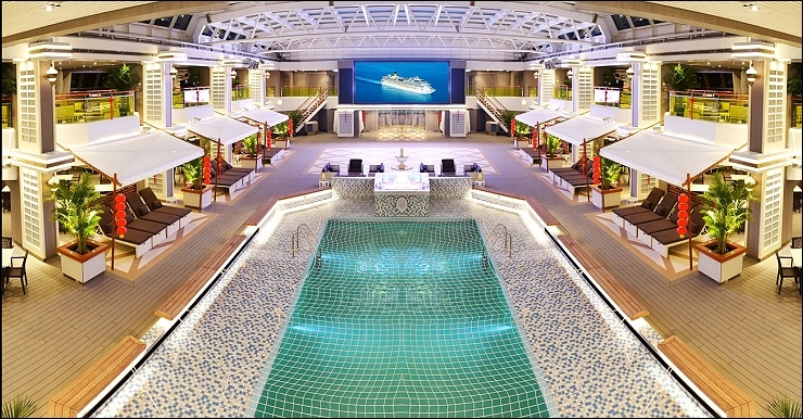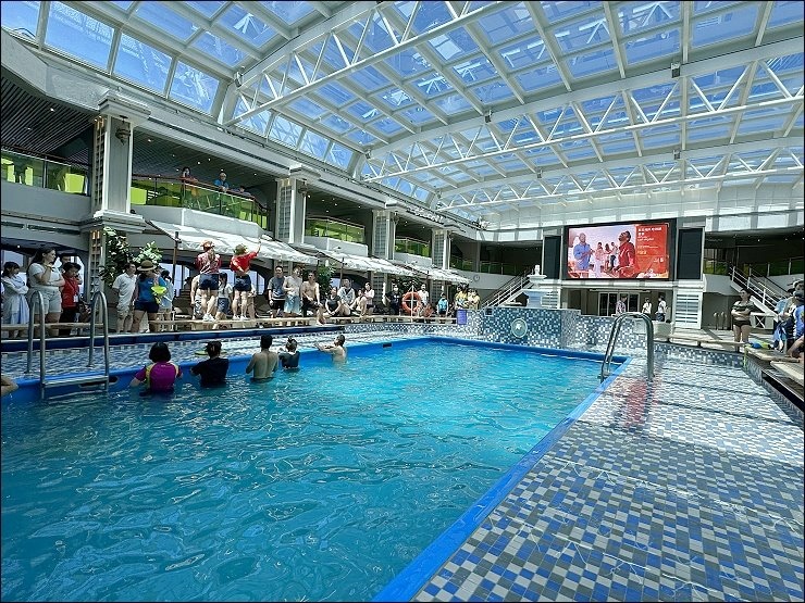 九樓Sole泳池、日光甲板與天幕影院,這區好美哦,路過一次拍一次的概念,這裡很多活動,像是早上的伸展課程、環拋比賽等遊戲與挑戰,晚上還有星空電影可以欣賞,每次經過都很熱鬧,泳池最後一天下船前才拍到空景!