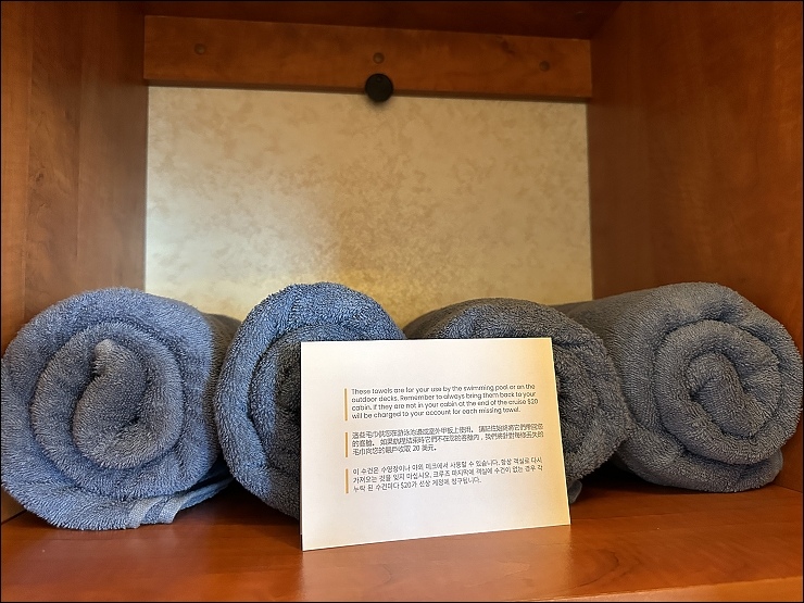 房間櫃子裡有放大毛巾,到泳池要自備毛巾,毛巾要記得帶回房間,若是沒帶回,房務整理房間發現毛巾有少會被charge哦。