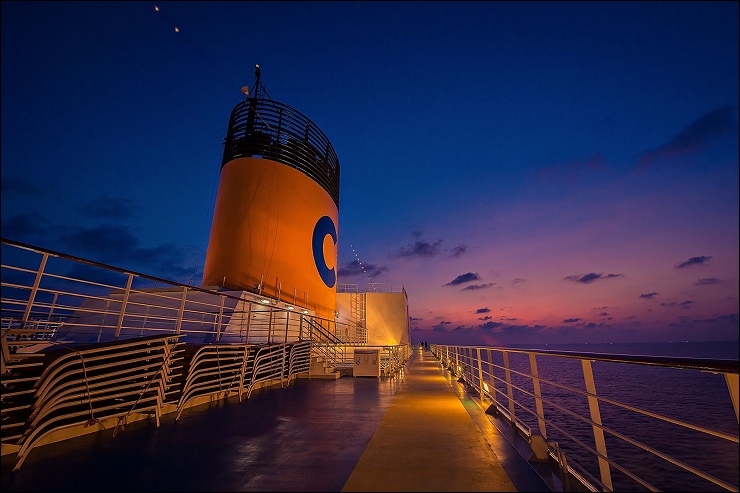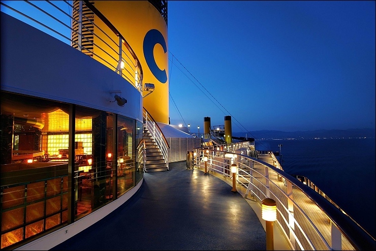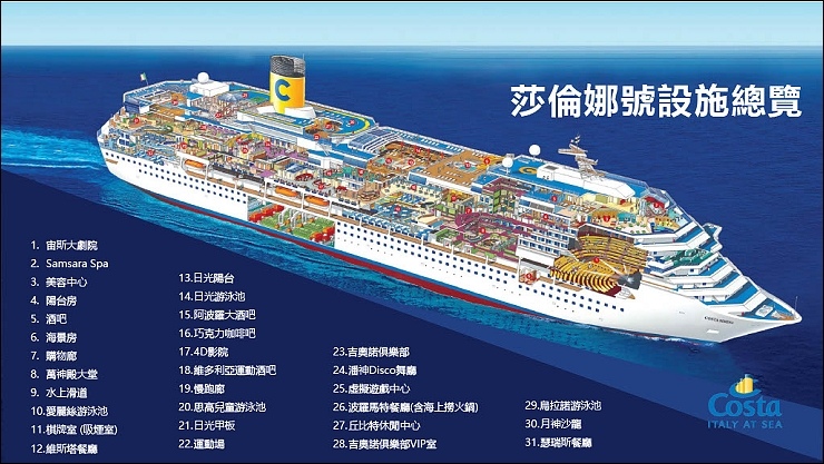 #歌詩達郵輪·莎倫娜號「歌詩達莎倫娜號 」(Costa Serena)有海上義大利移動城堡之稱,該郵輪重達11.45萬噸、甲板樓層共14樓,向以浪漫歐式氛圍著稱,也是歷來訪台噸位最大的郵輪。全船設計以「海上古羅馬,眾神與你同行」為主題,突顯濃厚的神話色彩與復古浪漫氛圍。