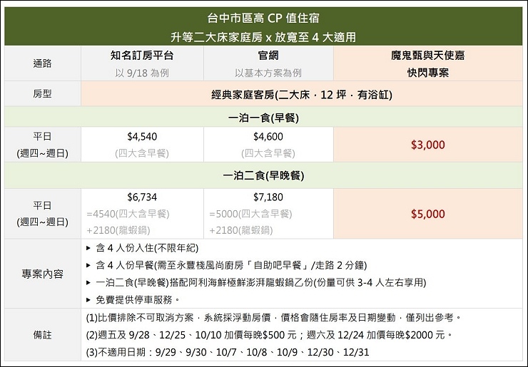 🔥近期最高CP值的台中住宿快閃就這間啦!親民價格地點好又有免費停車,最低$3000起放寬可以入住到四位大人含早餐,再升二大床家庭房,平均每人$750元起包一晚住宿及早餐;專案也有提供一泊二食,晚餐是在地都推薦的阿利海鮮龍蝦鍋(放進整隻15兩活龍蝦),按照慣例專案比官網和AGODA優惠(團購文附比價表),有興趣的團員請按讚分享並留言+1,有互動才不容易錯過開團資訊!! #最近查詢台中飯店房價都高不可攀,這檔的比價表真的很有感啊~~