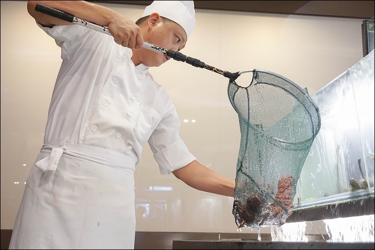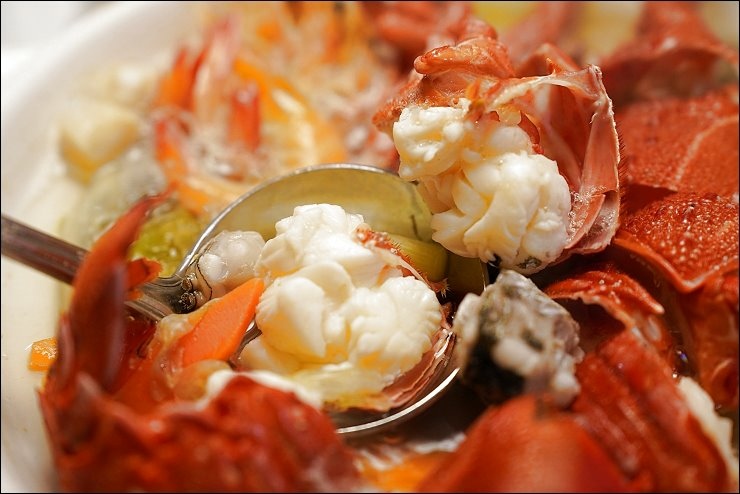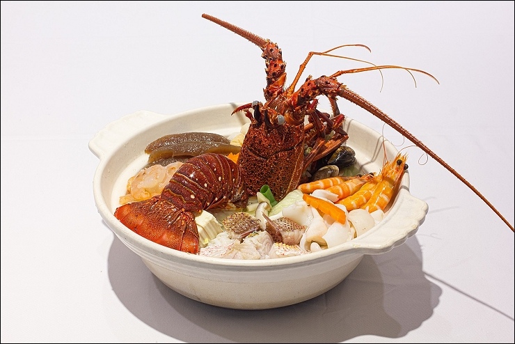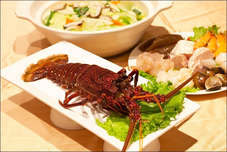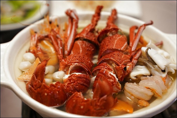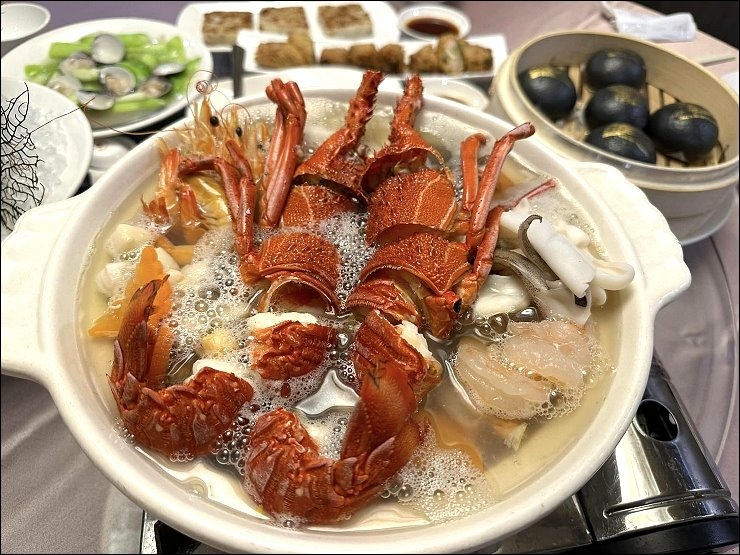 使用每日經過12小時高湯為基底,豪邁放進整隻重達15兩的頂級活龍蝦,再搭配包含烏蔘、白蝦、軟絲、草蝦仁、小干貝、鮮魚等多達8樣海鮮,份量可供3-4人左右享用。