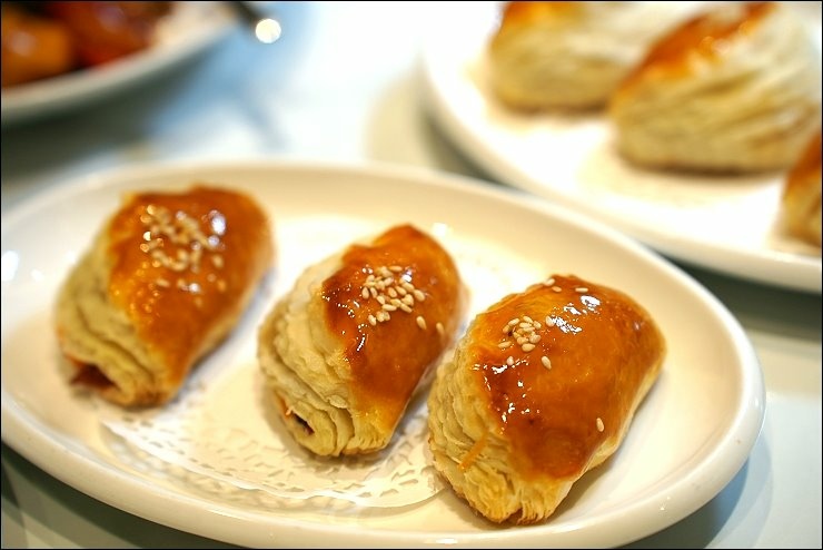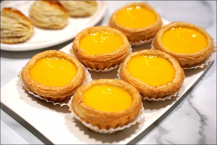 基本上來檀島,超人氣招牌極品蛋撻($45/個)及經典冰火菠蘿($55/個) 是必點,這次同行友人還加點蜜汁叉燒酥$125!檀島蛋撻很像燉奶那樣非常滑嫩又香,完全不會甜膩,檀島蛋撻的酥皮也很厲害,聽說酥皮的製作需要三天時間非常費工,創造出192層,層層疊疊非常酥脆的口感,小姑我來檀島一定要吃蛋塔的!冰火波蘿油有大顆跟小顆,大顆的份量很大,建議分食或是直接點小顆的就好,奶油讓冰火波蘿麵包吃起來很順口!