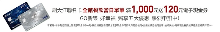 刷大江聯名卡全館餐飲當日單筆滿1000元送120元電子現金券(每月最高回饋240元)。