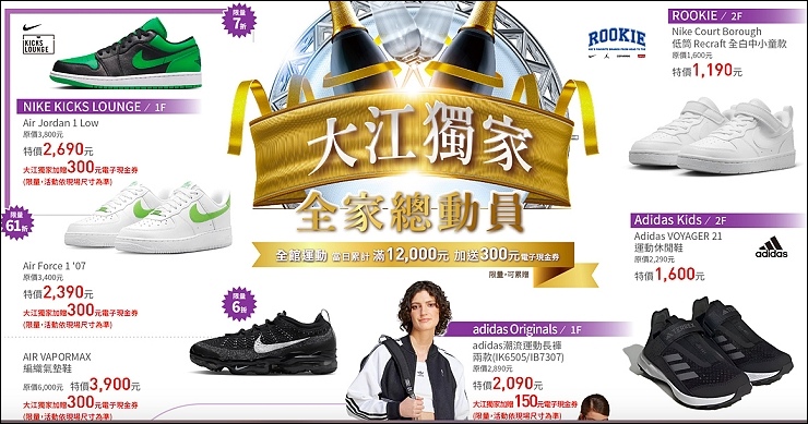 多款男女鞋款獨家特惠!Air Jordan 1 Low喬丹鞋原價3800,特價2690元,大江獨家加贈300元電子現金券,還有每個人都要有的Air Force 1,原價3400元,特價2390再獨家加贈300元電子現金券,優惠都是限量啊!