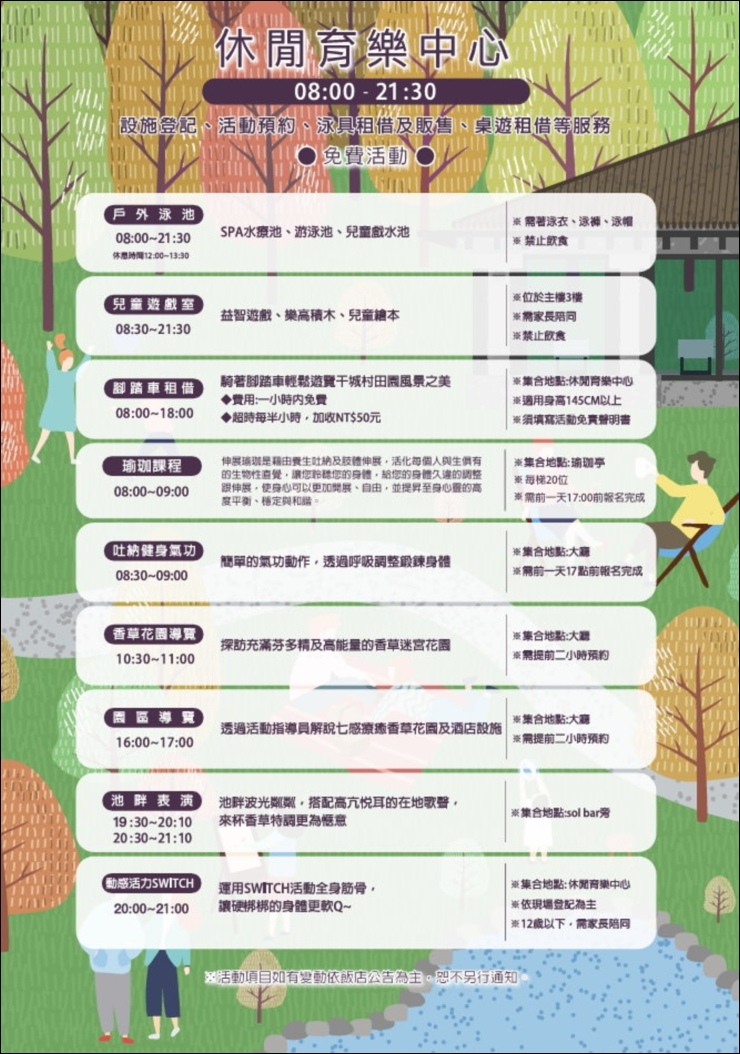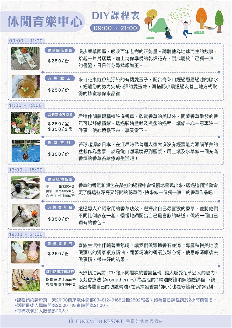 休閒育樂中心活動表提供大家參考,身為一個坐擁萬坪有機香草花園,全國唯一以香草特色主題打造的度假村,連DIY都是被香草氣味大包圍啊~~~