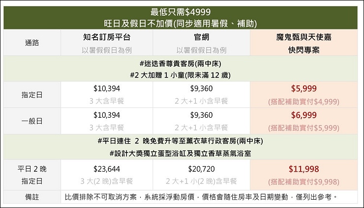 搭配補助最多現折$1000,暑假平日最低更只需$4999,平日連住2晚再限量升等行政客房。