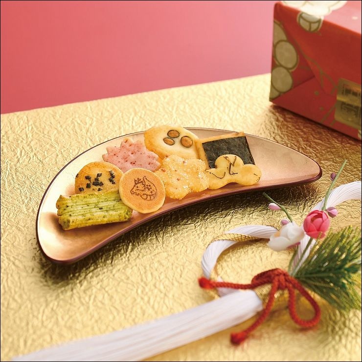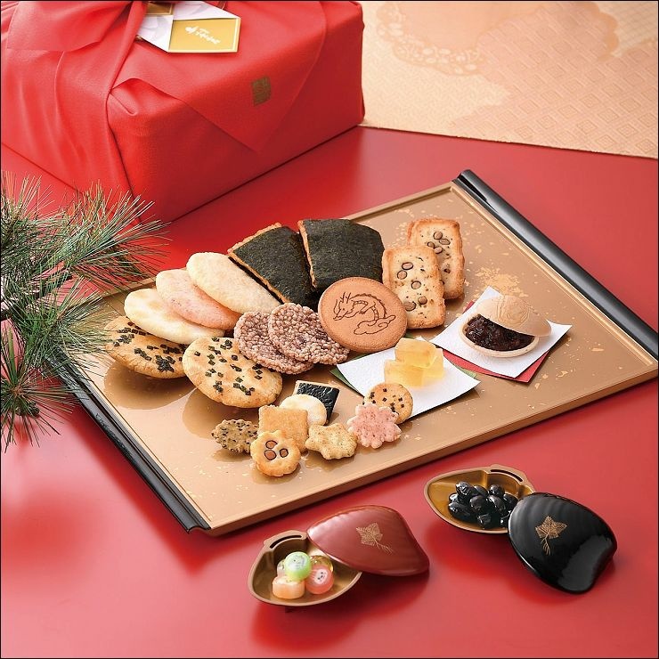 日本京都小倉山莊新春限定版禮盒,以祝賀“松茸梅”為主題,使用蝦和海帶等吉祥材料,以及帶有生肖標誌的雞蛋餅,使用新春的祝賀包裝,只有新年才會推出的限定版。