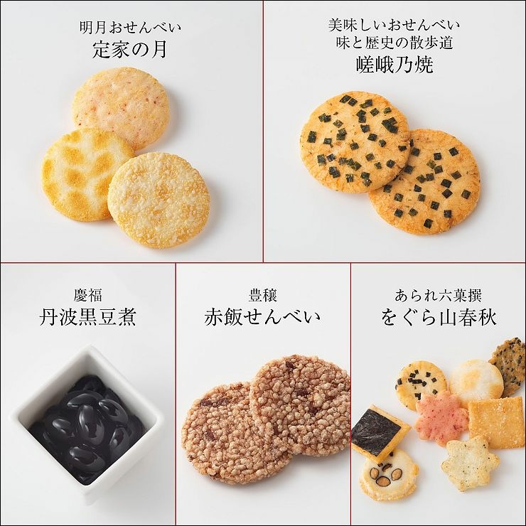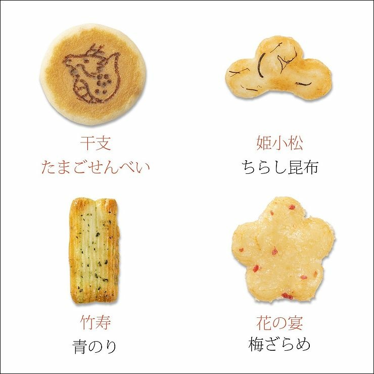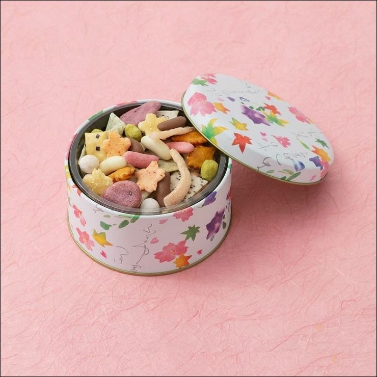 蕪村あられ春秋(1袋8ヶ入)×2袋:四個季節的顏色用詩句來表達,描述了三個代表日本優雅的景點。八種可愛的米菓,秋葉,滿月,六邊形和正方形,帶有海苔,海帶,海藻,蝦和芝麻等有趣的口味。