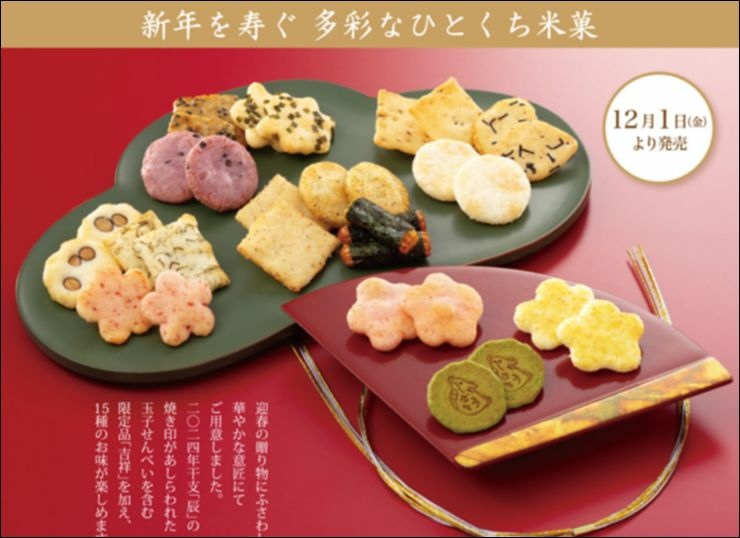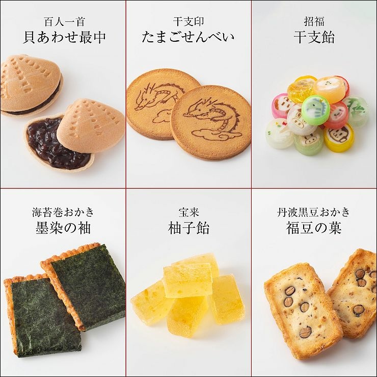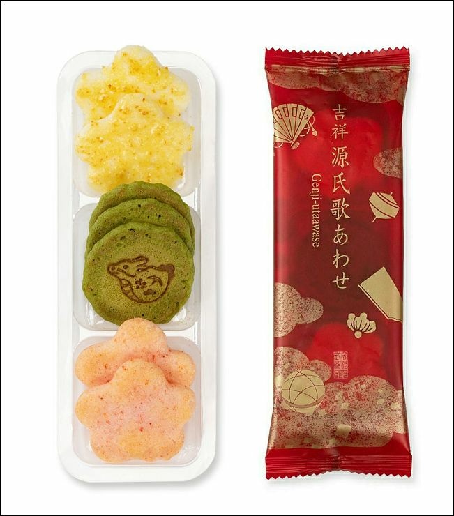 新品三連發!!日本新年限定吉祥源氏歌仙貝禮盒,來自於京都宇治式部後源氏物語禮品店,與知名小倉山莊、蕪村庵等仙貝名店為同體系,新年限定吉祥源氏歌仙貝禮盒,包裝了帶有紅色和黃色梅花的米果,表達了迎接春天的喜悅,並在上面印上了龍年限定生肖。