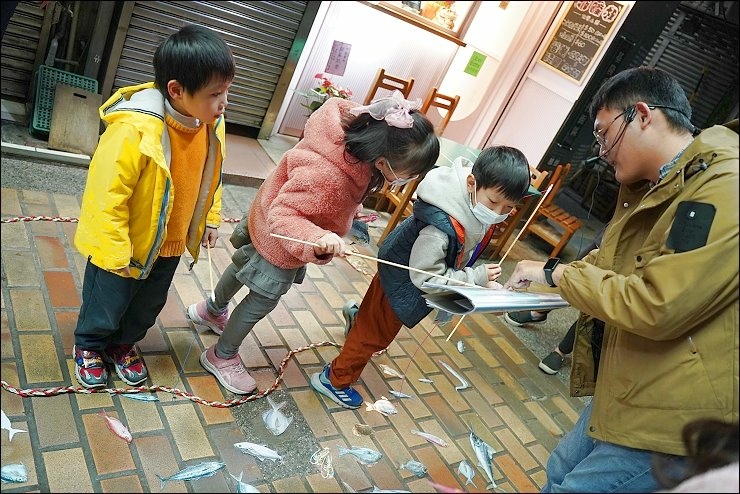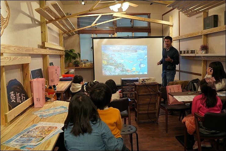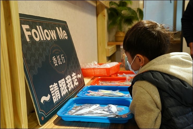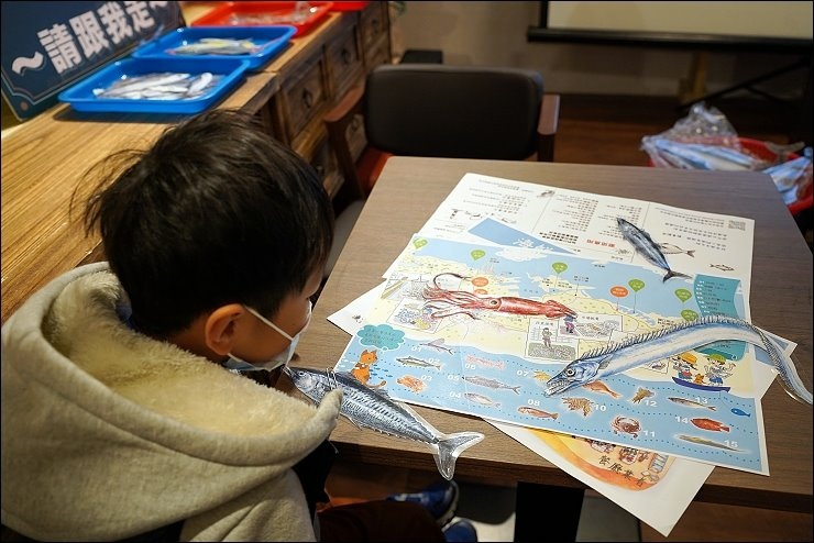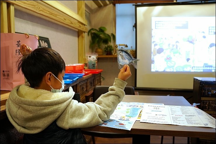 用餐後,下午是釣魚小學堂課程,營造北部最大批發魚市:崁仔頂魚市的環境氛圍,仿造魚市場生態,在基隆的捕魚方式有哪些?會捕到什麼魚?魚捕上岸後,會怎麼處理?基隆的魚市在哪裡?魚市有什麼文化?豐富有趣、由淺入深的課程內容,加上互動及有獎問答讓孩子也很有參與感,讓孩子了解基隆在地的海鮮產地和基隆的連結。