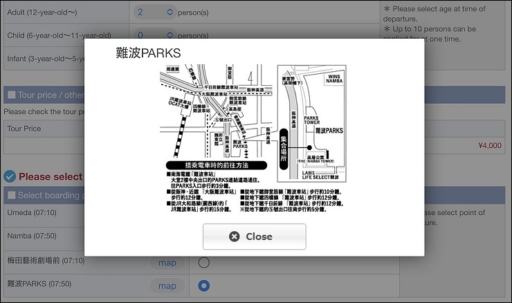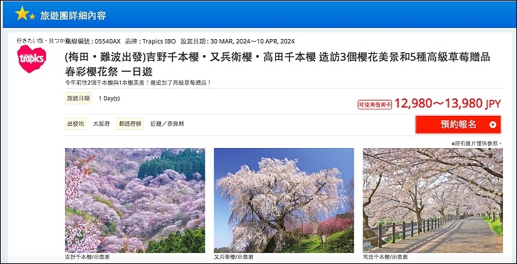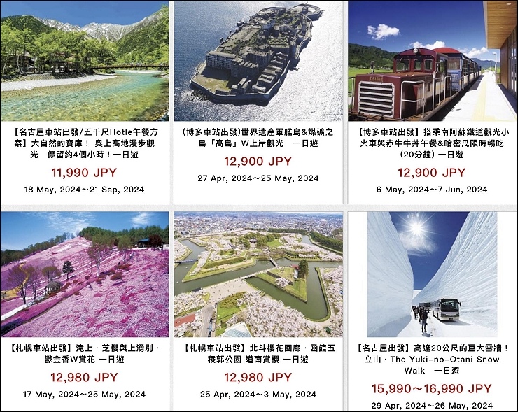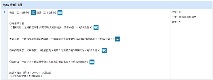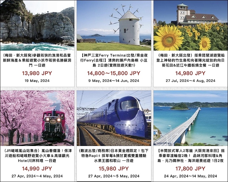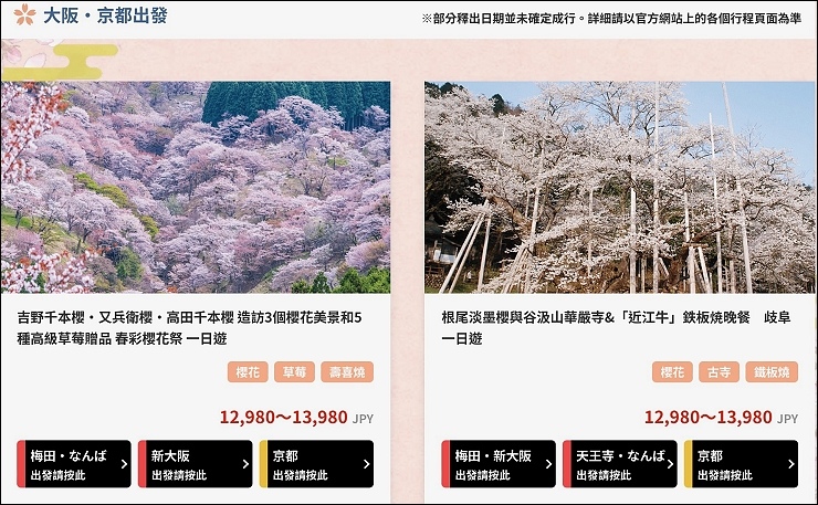 官網:https://bit.ly/3ITyEaL ,官網有繁體中文,預約無障礙,旅行費用所包含的項目、含不含餐、門票、行程表,推薦景點、重要事項、路線計劃日程及其他說明,通通寫的很清楚,點進去預約可以看到集合地點,像是大阪就有難波、梅田、新大阪出發的,選擇很多。下訂前一定要仔細看重要事項及規定哦!