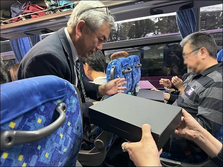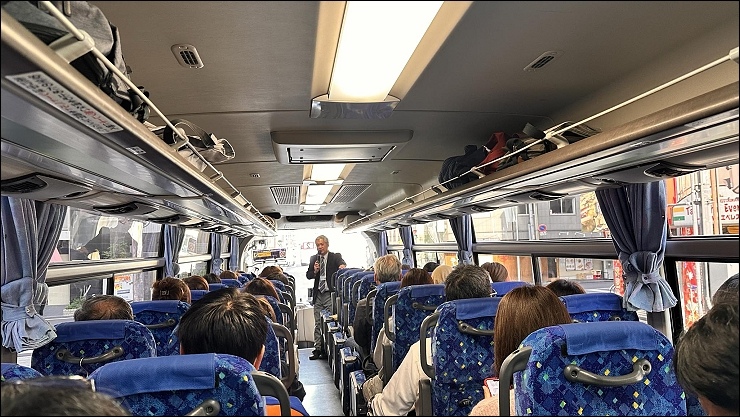 阪急交通社的一日遊都有一位隨車領隊,主要為日文,但領隊會有語音翻譯平板,若有緊急情況需要時,還是可以協助的。上車後隨車領隊簡單自我介紹,車上全車禁煙,可以飲食,交談時降低音量,並提醒大家隨團貼紙要小心貼,避免貼在毛料的衣服或皮革的包包上,怕黏到膠。 全車除了我跟友人,其他全都是日本人啊,這還真是跟著日本人在玩日本呀!!出發!!