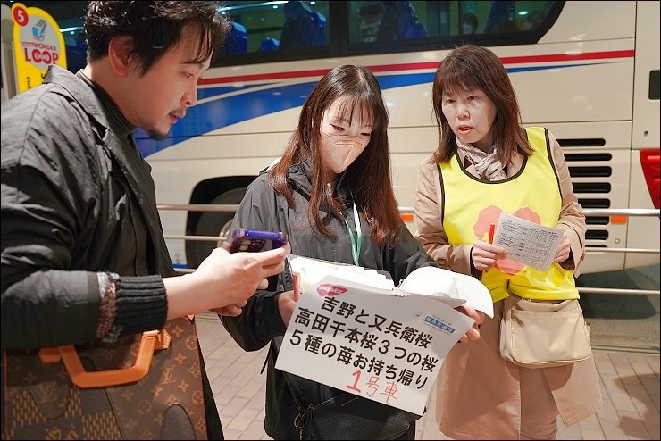 七點多就來報到囉!可以直接報名字或是出示手機上的報名資訊給工作人員確認即可,有些日籍遊客還拿出列印出來的報名表印。報到完成,每個人都會拿到一張貼紙,這是團員的標記哦!我們這次這個行程報名人數多,出二台車!