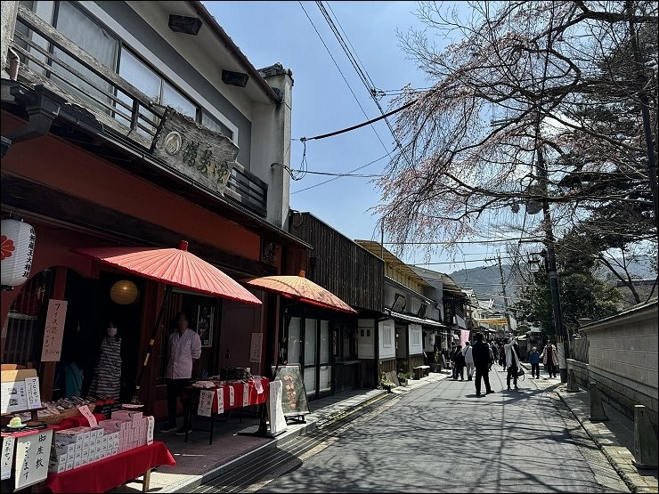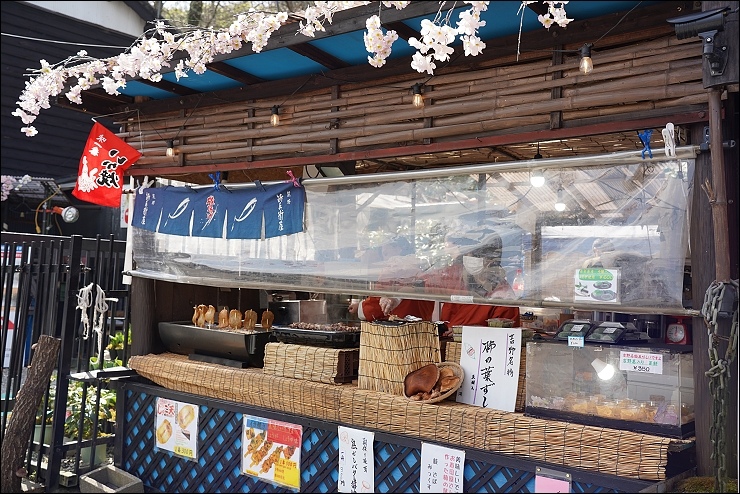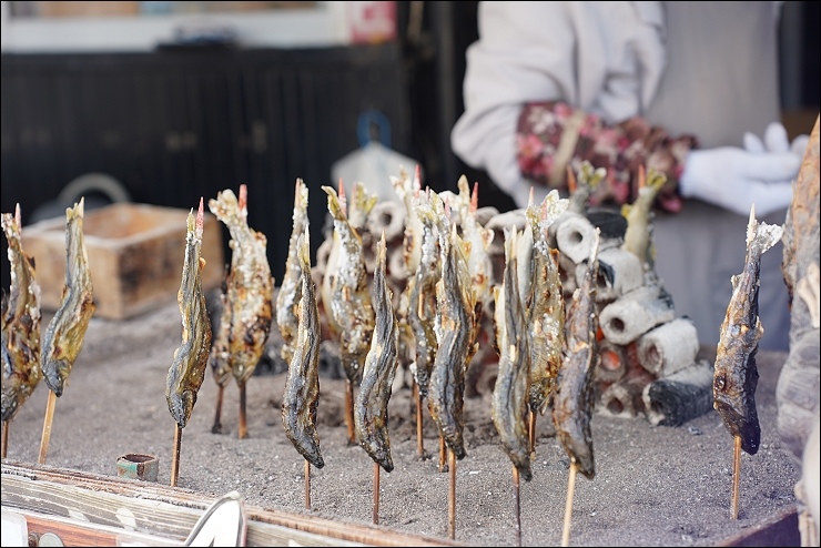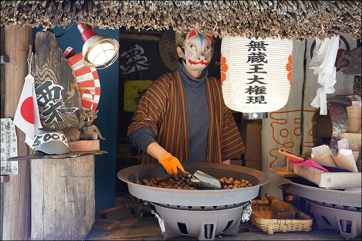 沿著老街步行,在地老商店可以順路逛逛,每次看到烤香魚都會忍不住想吃,戴著面具炒栗子也很吸睛!