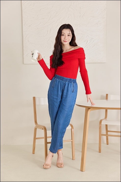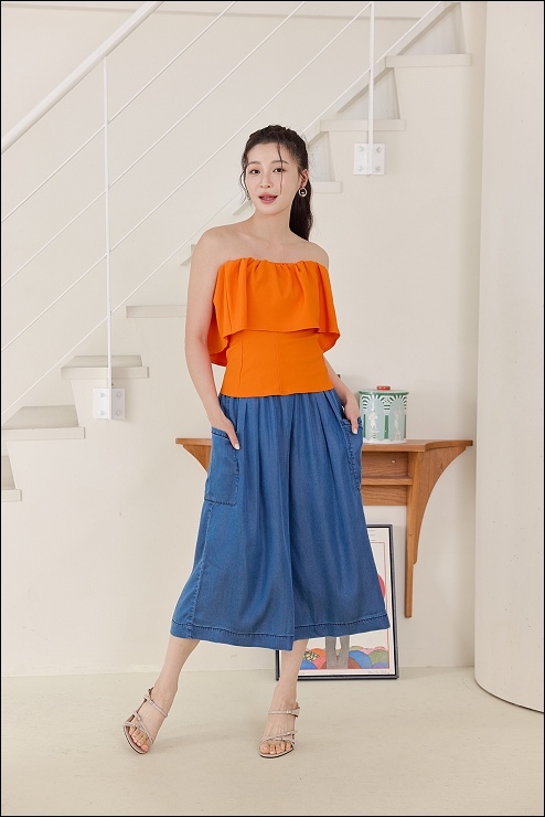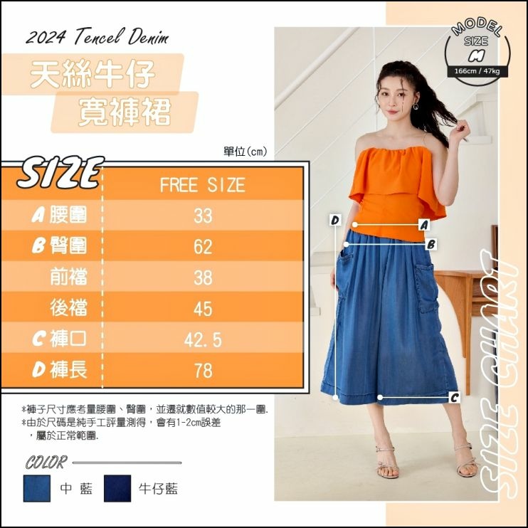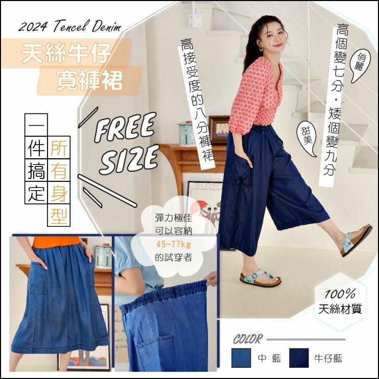 天絲牛仔寬褲裙:八分褲裙是大家都可以接受的長度,高個變七分更顯俏麗、矮個變九分,一般身型就是八分。更厲害的還是free size,單一尺寸,彈力極好的鬆緊帶竟然可以容納45公斤~77公斤的試穿者都沒問題!!
