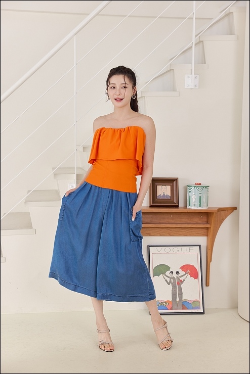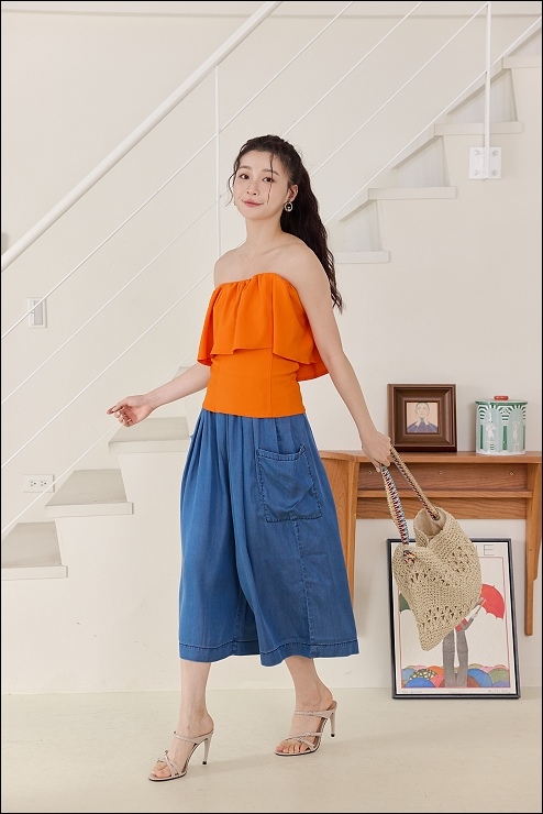 天絲牛仔寬褲裙:八分褲裙是大家都可以接受的長度,高個變七分更顯俏麗、矮個變九分,一般身型就是八分。