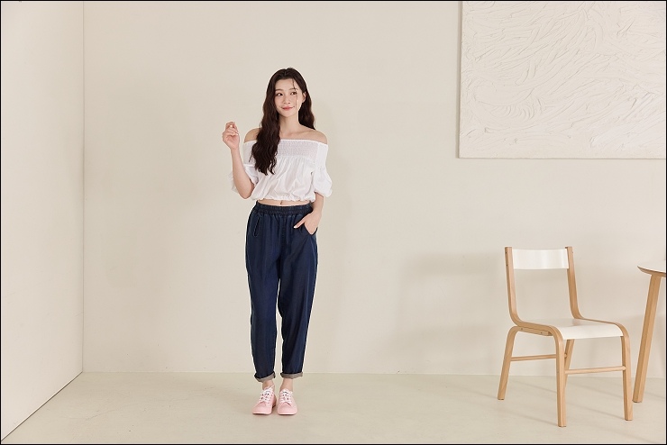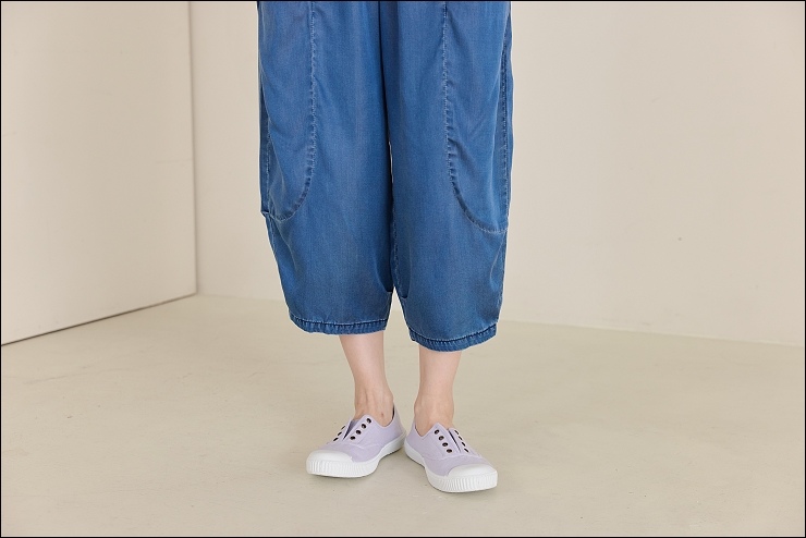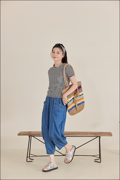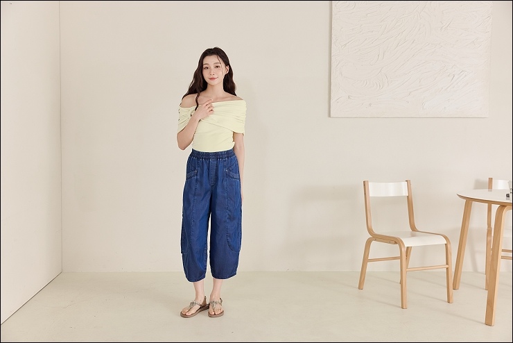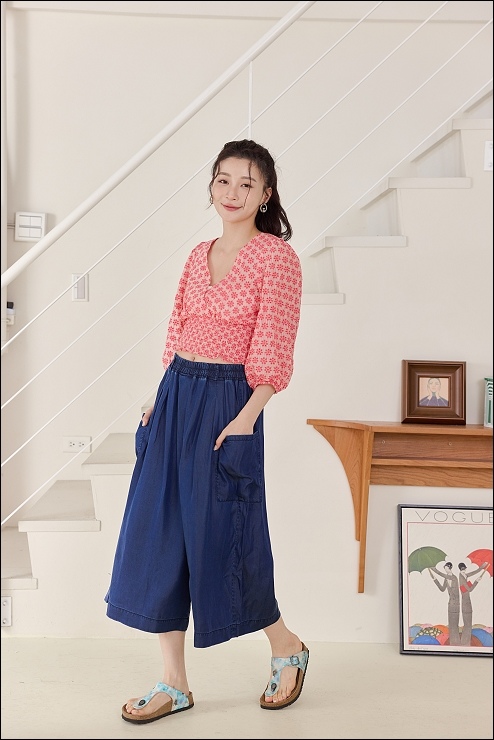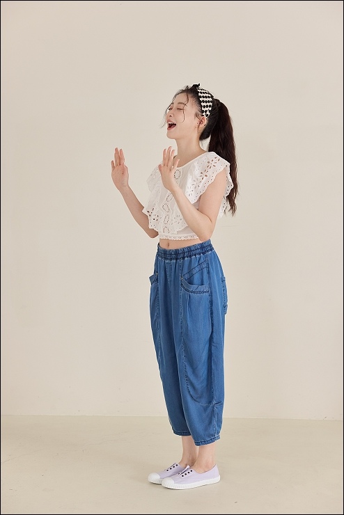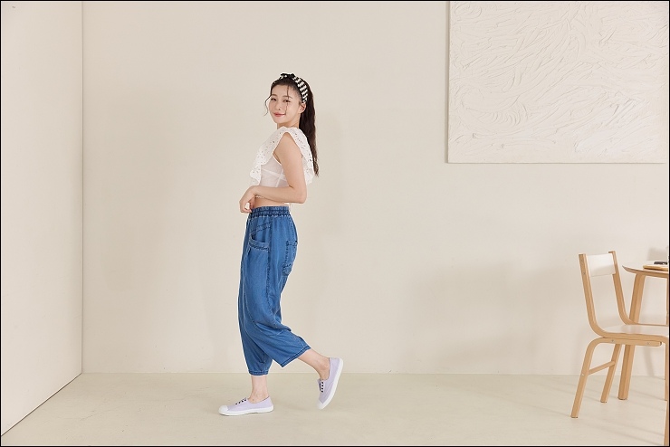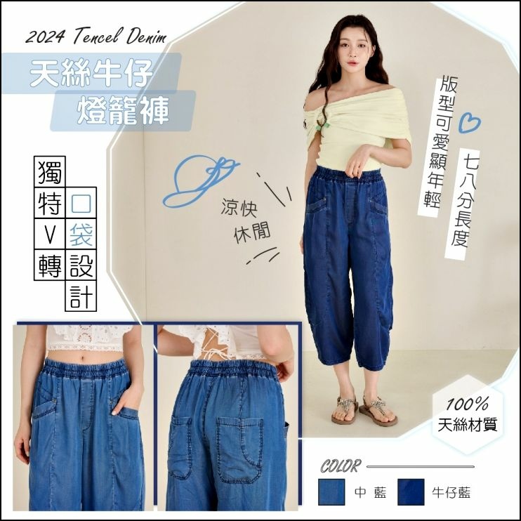 天絲牛仔燈籠褲:版型可愛顯年輕,獨特V轉口袋設計,七八分長度涼快休閒。