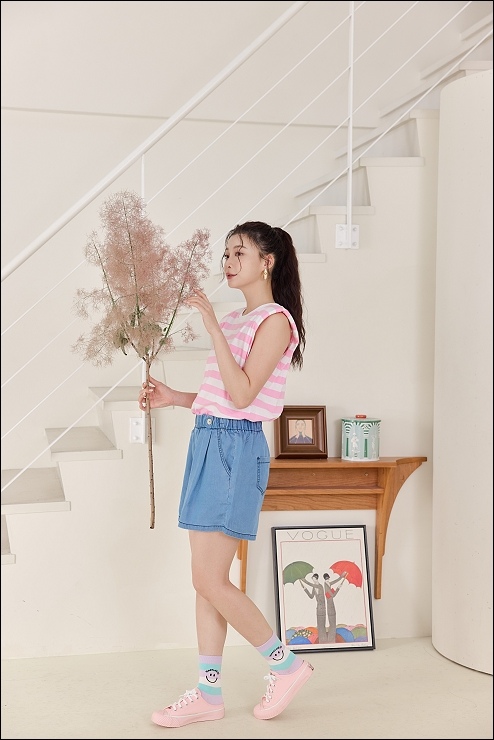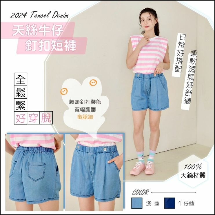 天絲牛仔釘扣短褲:腰頭釘扣裝飾,全鬆緊好穿脫,寬幅腿圍襯腿細。
