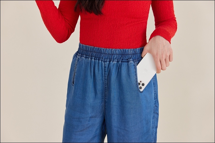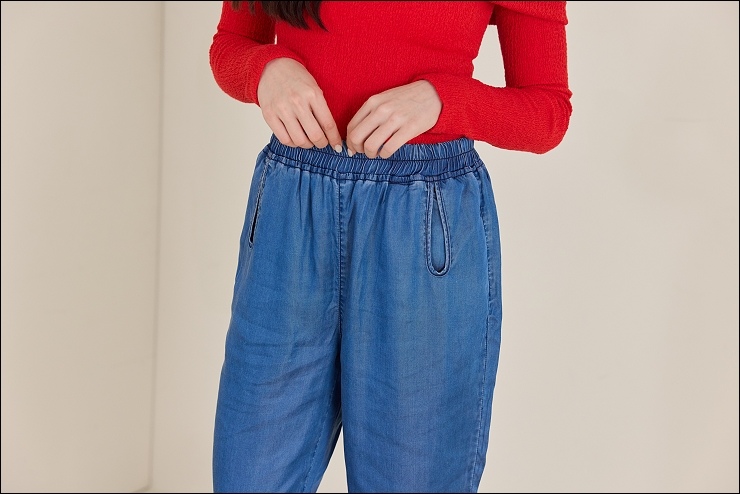 天絲牛仔魔術口袋褲:水滴造型口袋夠深,易拿取物品,版型修飾曲線,長度全長。