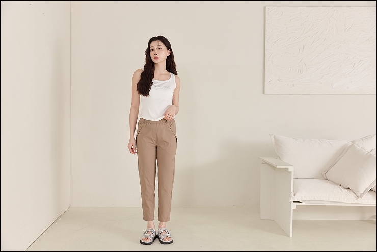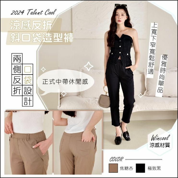 涼感反折斜口袋造型褲:兩側反折口袋正式中帶休閒感,上寬下窄寬鬆舒適,優雅時尚單品。