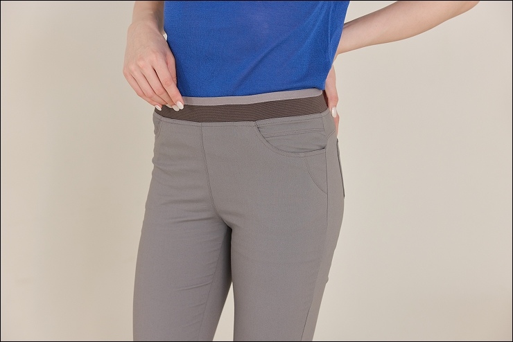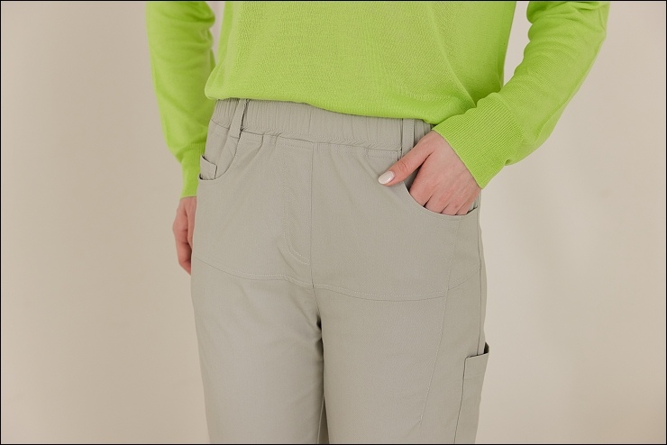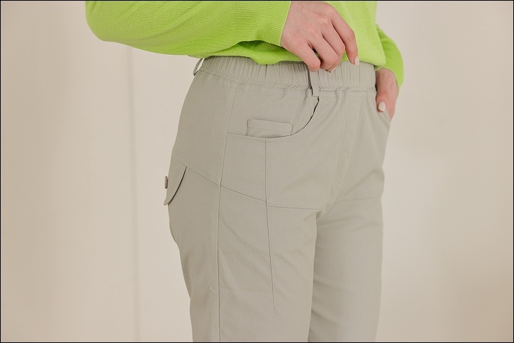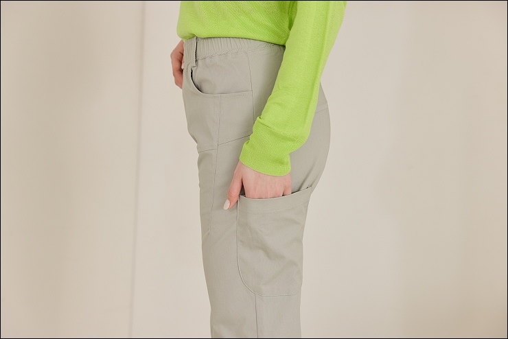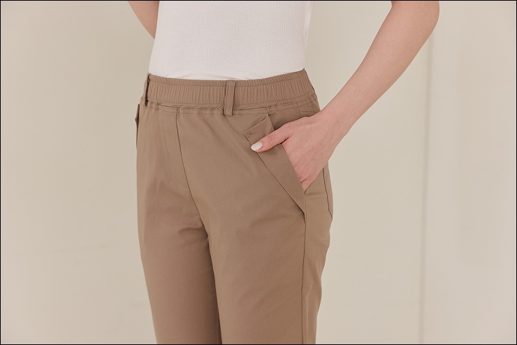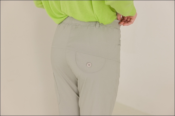 涼感個性剪裁褲:前後腹部特殊剪裁連動,後側僅單邊圓型口袋蓋設計好俏皮,長度全長適合上班族。