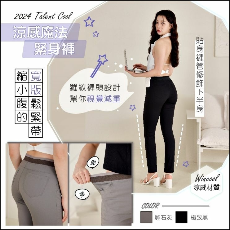 涼感魔法緊身褲:縮小腹的寬版鬆緊帶又回歸啦,羅紋褲頭幫你視覺減重,不用辛苦減肥🤣,貼身褲管修飾下半身。