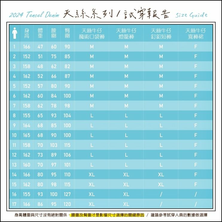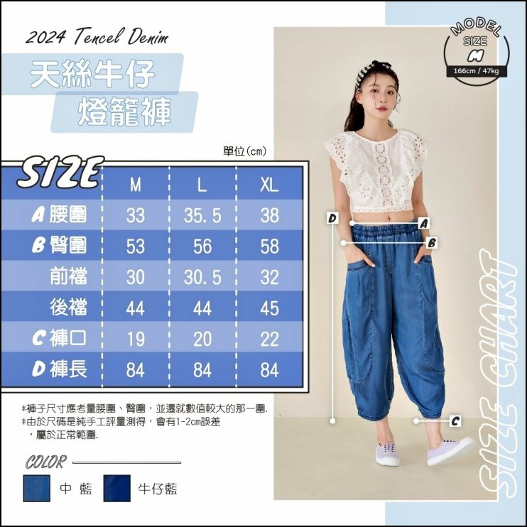差點忘了提醒大家,天絲牛仔褲的布料沒彈性,要請大家仔細參考尺寸表,斟酌考慮尺寸,下單前也可以私訊客服給予建議喔。