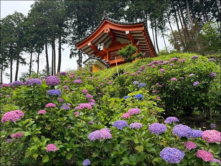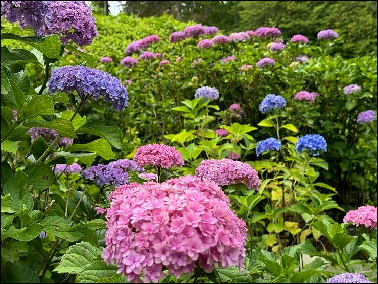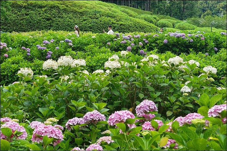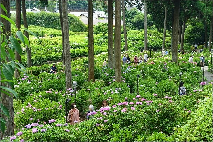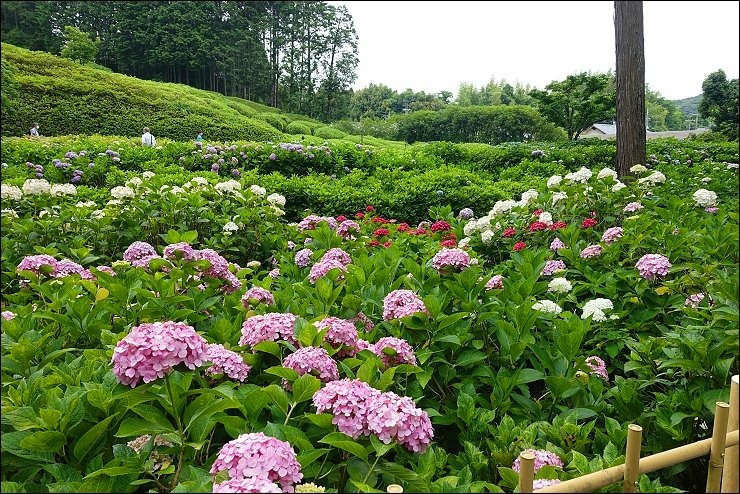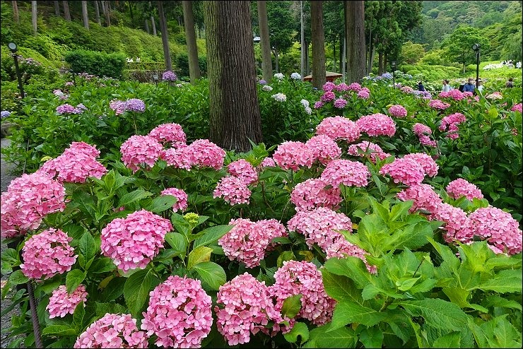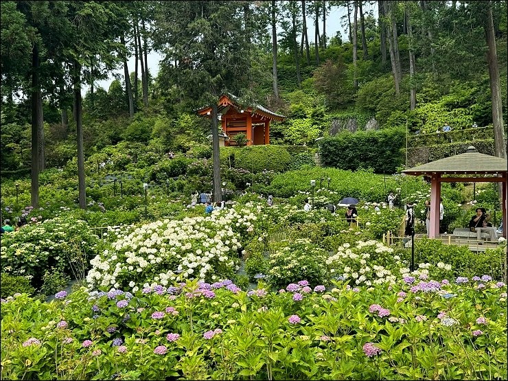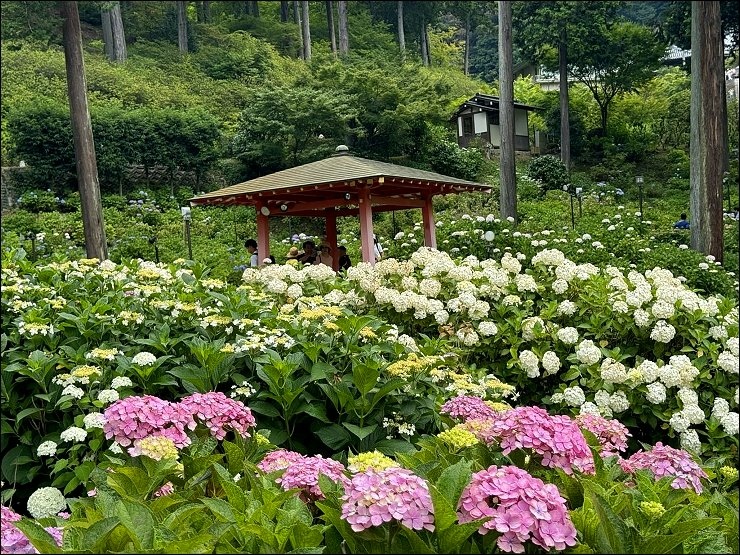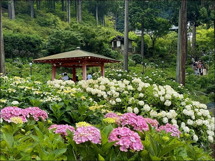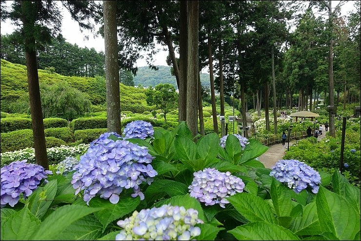 進入山門後就是整片的紫陽花庭園散落在山丘地上,我第一次來就遇到不錯的花況,整片紫色、紅色、藍色的繡球花,很是壯觀。